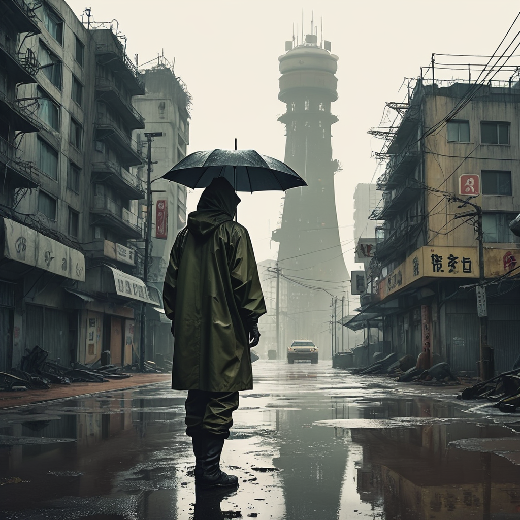 "Lone man in a nuclear storm, (man wearing raincoat with hood up, holding umbrella, standing alone:1.2), Post-Apocalyptic style, abandoned cityscape in the background, muted colors, gritty textures, by hideo kojima and takashi miyazaki, hd, artstation"