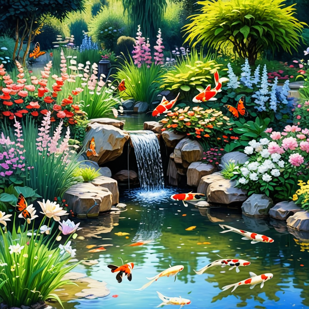 "A peaceful garden with a waterfall and koi pond, (butterflies flitting among the flowers:1.2), impressionist painting style, by Claude Monet or Vincent van Gogh, hd"