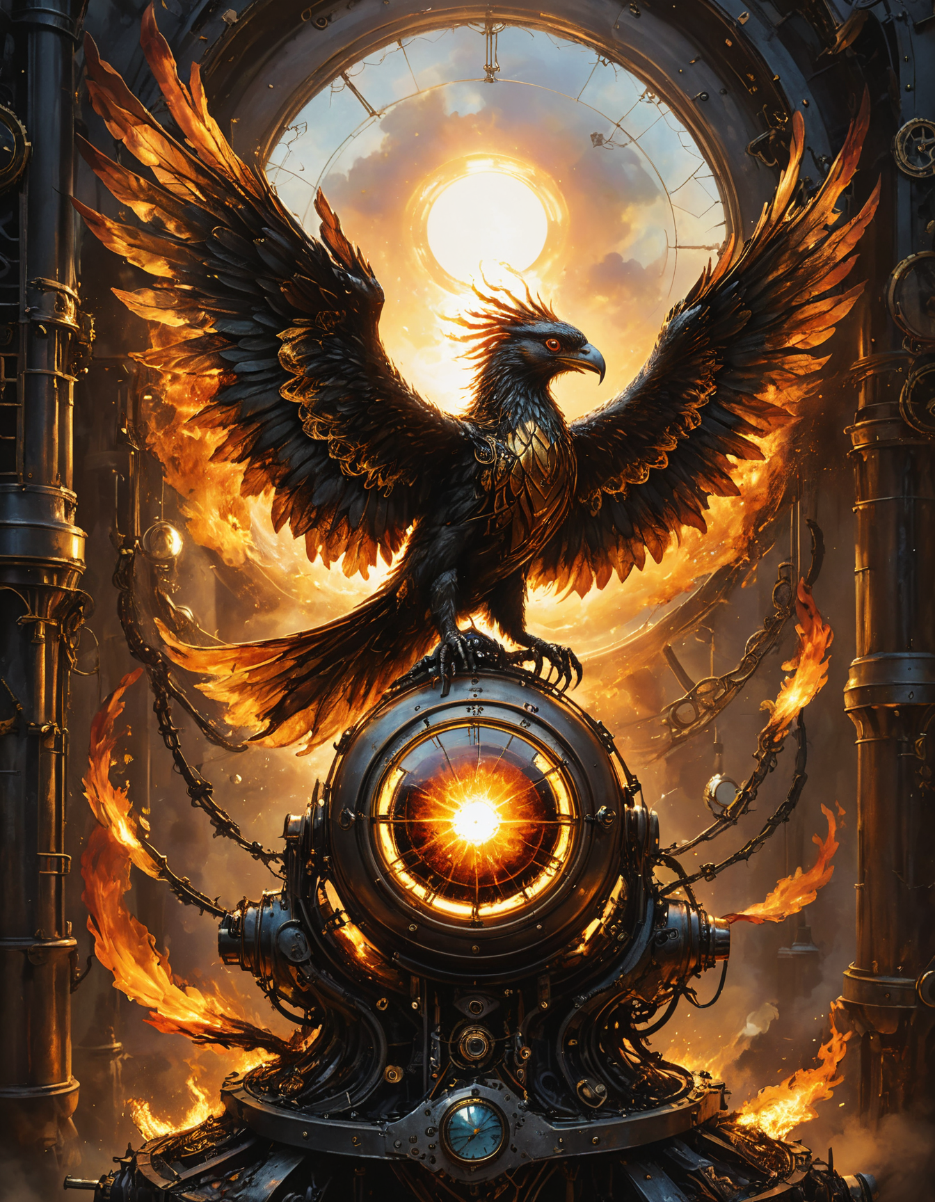 ([by ROA|by Alan Fletcher]:1.5), (As the celestial spectacle unfolds, the golden wings of the Phoenix emerge from the ashes, their petals aglow with life. The air is filled with a kaleidoscope of fiery flames that dance around it, creating a mesmerizing display of light and color. Each crackle and shimmer, the egg's shell glows with an otherworldly energy, as if alive. A testament to the eternal cycle of creation and resurgence, the scene is bathed in a radiant aura of renewal. Behold, as the sun begins to set, a symbol of grace rising from the ashes, embodying the timeless spirit of renewal.:0.5) (Steampunk fantasy:1.3) <lora:xl_more_art-full_v1:0.5> <lora:add-detail-xl:0.7> <lora:MJ52:0.4>