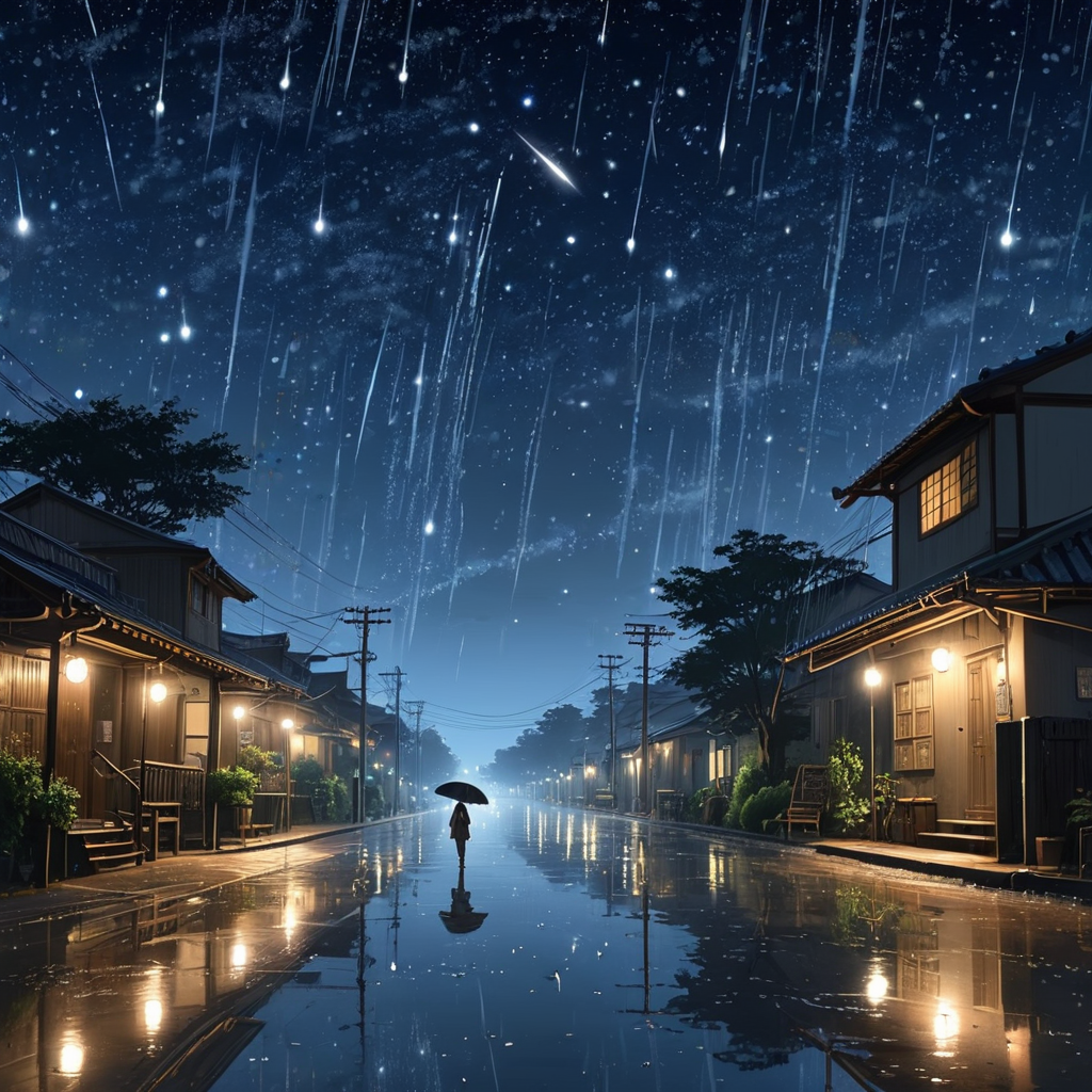 "A rain of falling stars in a night sky setting, (realistic yet whimsical style, like Hayao Miyazaki or Makoto Shinkai), by Vincent Warns or Takeshi Obata, hd"