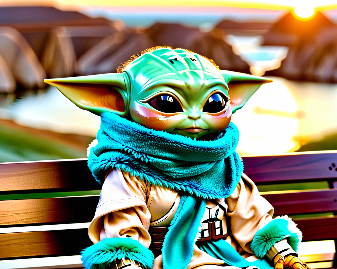 <lora:mandalorian_SDXL:0.5> mandalorian<lora:Grogu:0.8> Grogu using the force magic, (designed by Naoki Urasawa:0.9) , upper body shot of an athletic Metalhead (Wife:1.3) , Parched and Layered, sitting in a Backless bench, Chibi Turquoise Fur Scarf, at Golden hour, Wide view, Psychological thriller, intricate plots, diverse characters, technology, confident, flowing, gorgeous, excellent composition