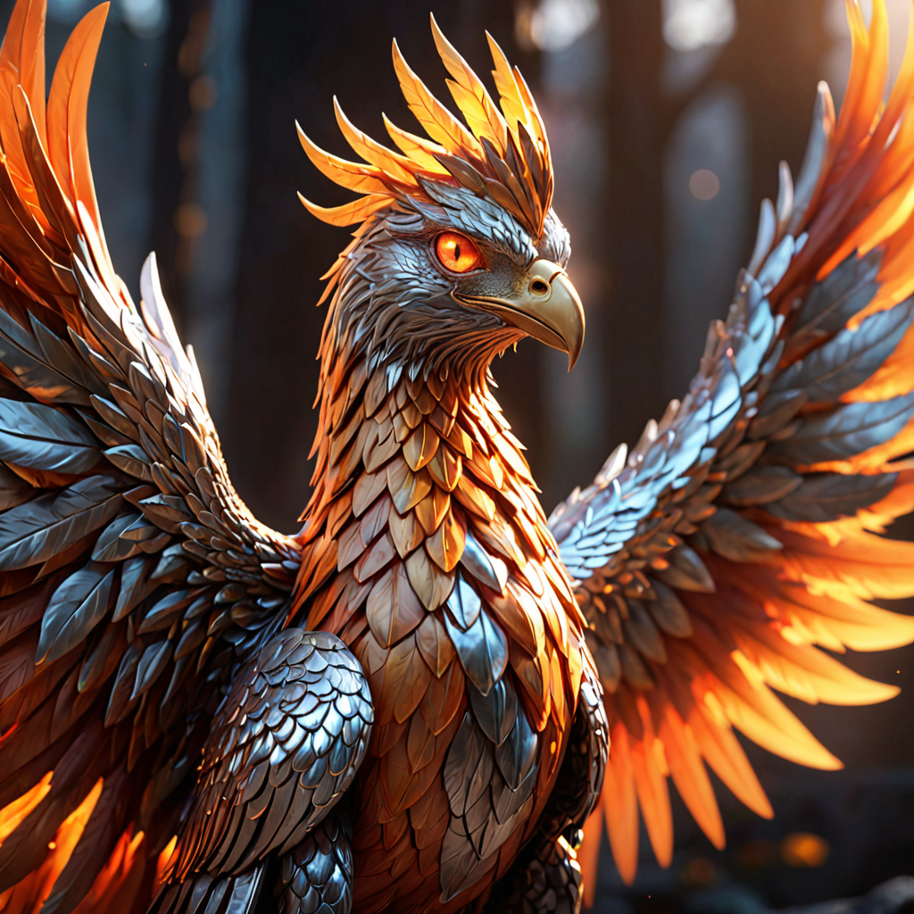 A fantasy phoenix, (glowing almond eyes:1.25), silver scales, colorful, deep orange color, (depth of field:1.25), 8k resolution, photorealistic, masterpiece, intricately detailed, natural lighting, volumetric lighting, concept art, elegant, artstation, sun blicks