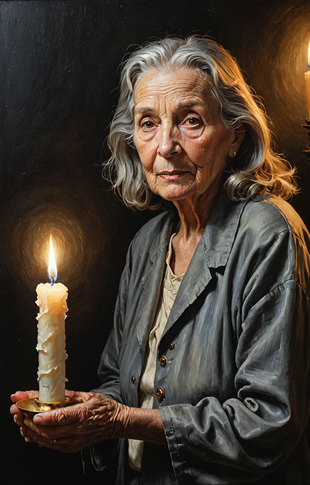 highly detailed, realistic, A framed oil painting of an old woman, golden skin, wrinkled, grey hair, holding in hand a candle, the light of candle on frame, beautiful oval frame, candle is position near frame full frame, wide shot, frame damage from the candle, burn frame by candle <lora:RMSDXL_Enhance:1> <lora:add-detail-xl:0.8> <lora:Illusionix:1> <lora:ClassipeintXL2.1:1>, low key lighting, cinematic lighting
