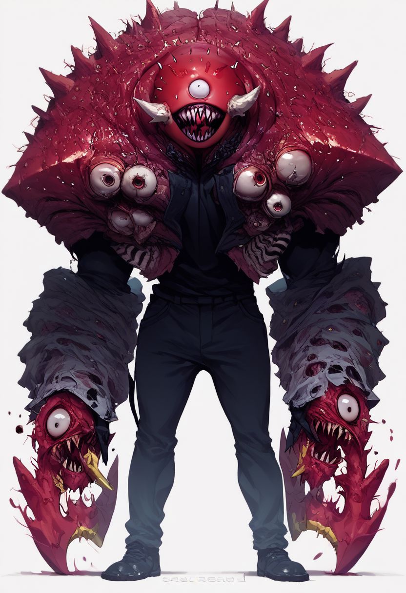 score_9, score_8_up, source_anime, creature made of red blood, shiny, wild, huge eyes, jagged teeth, spiky carapace, moldy, white background