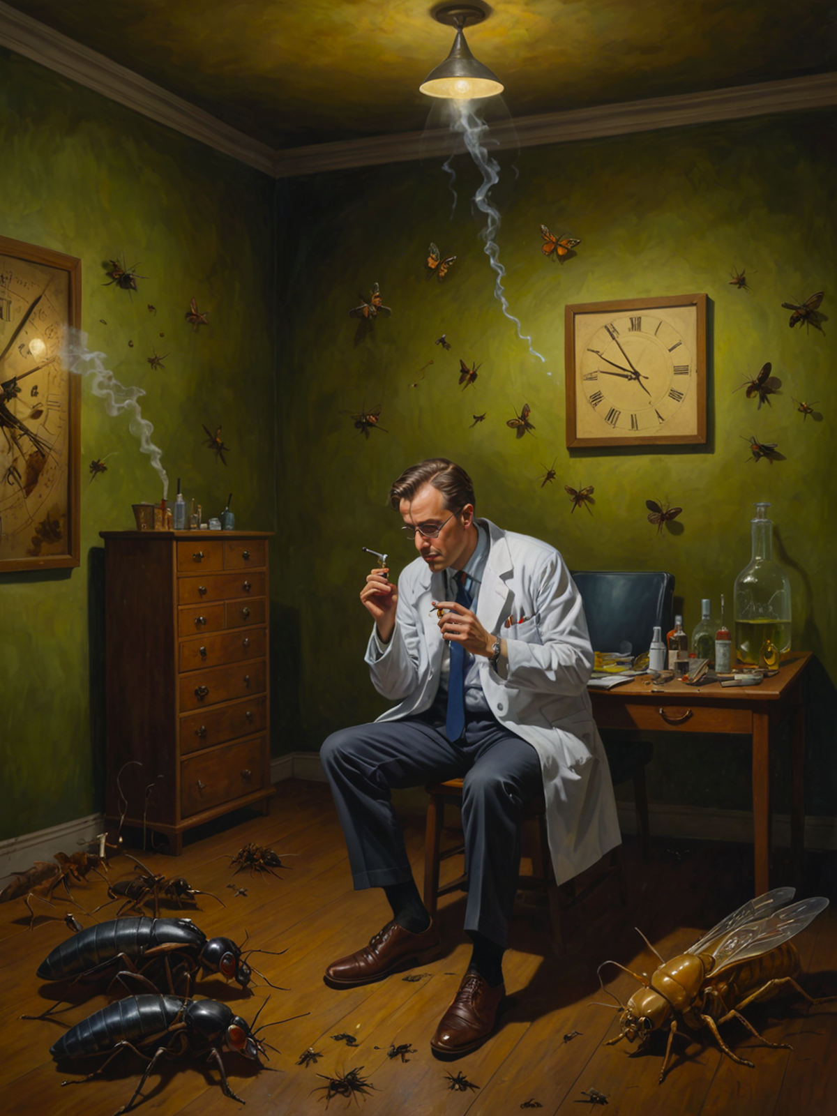 A photorealistic painting of a person in a lab coat smoking a cigarette, surrounded by various insects and creepy crawlies. The scene is set in a dimly lit room with a clock on the wall. The person in the painting appears to be a scientist, possibly working on a project involving insects. The insects in the painting are of various sizes and shapes, with some crawling on the floor and others on the walls. The overall atmosphere of the painting is mysterious and intriguing, with the scientist seemingly lost in thought as he smokes his cigarette. (guidance scale = 1.4)