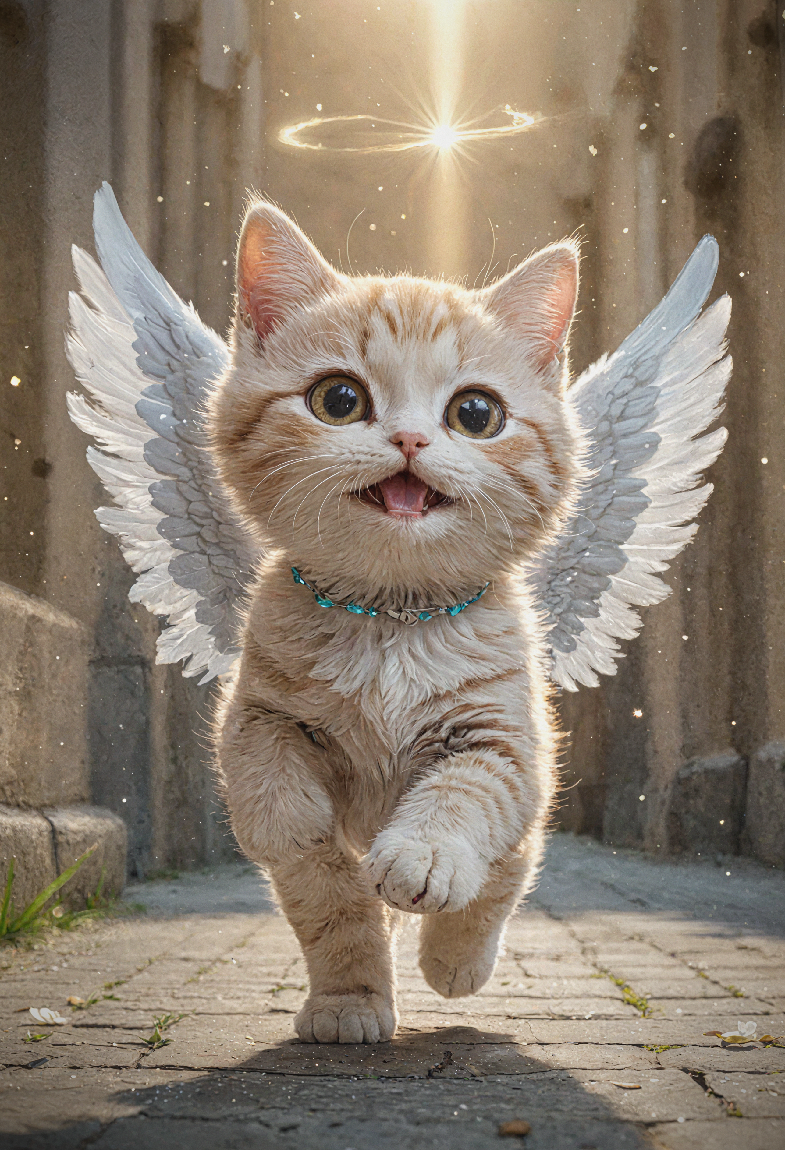 close up of a cute cat with little angel wings ascending to heaven, walking toward the camera all happy, CGI, chibi style, levitating