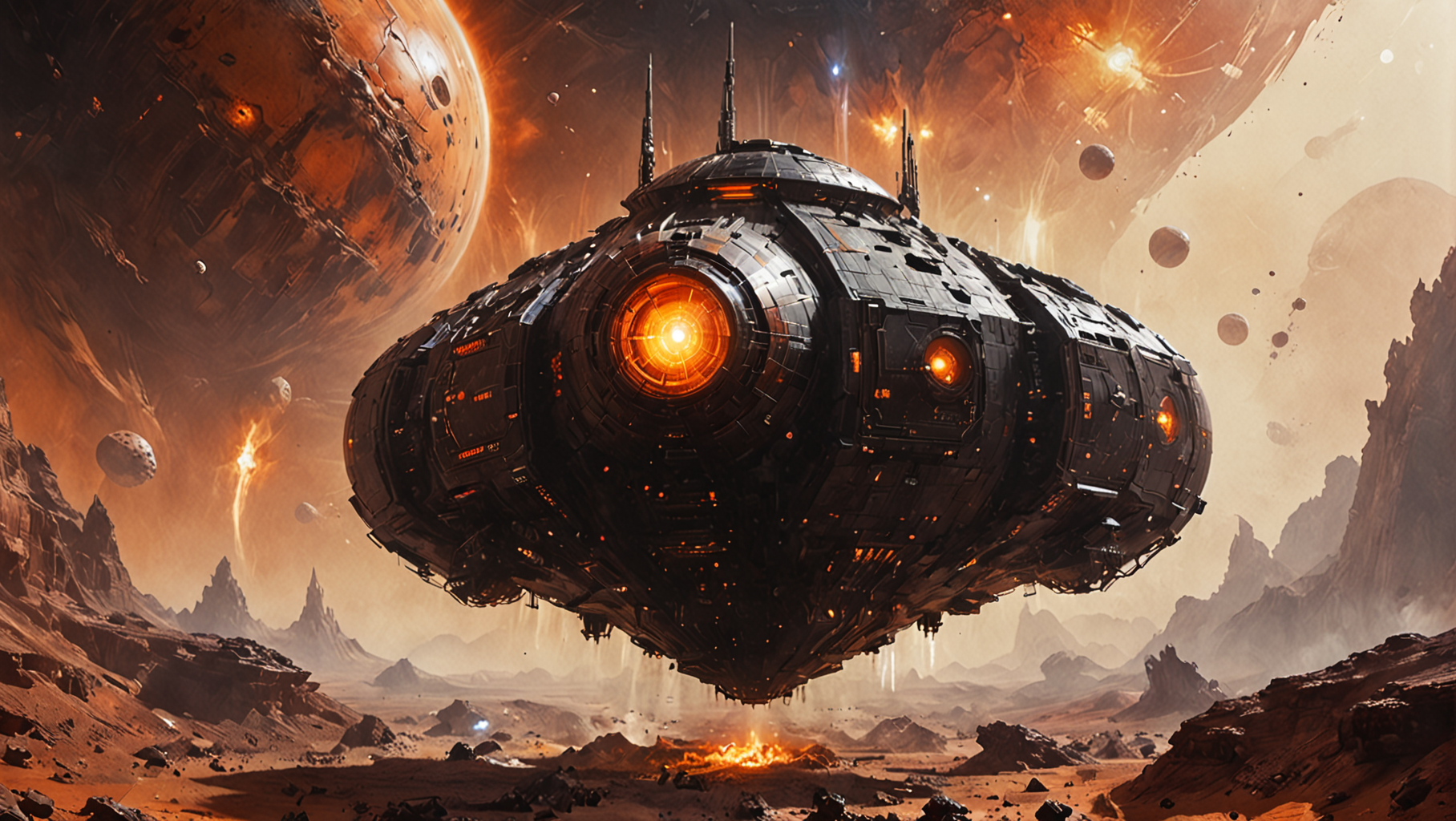 giant futuristic dark spaceship orbiting a red planet, orange theme , creative, photorealism, hyperrealism, Fine art photography style, Fine art cinematic photography style, shallow depth of field, vignette, highly detailed, high budget, bokeh, cinemascope, moody, epic, gorgeous, film grain, grainy <lora:Desolation:0.3> <lora:Fine art photography style:0.7> <lora:Digital Art Style SDXL_LoRA_Pony Diffusion V6 XL:1>