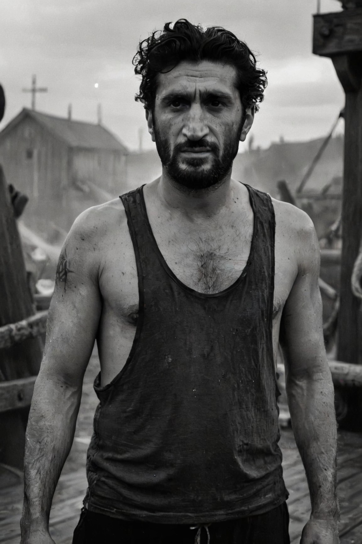 <lora:Tank Top Stringer Shirt SDXL:0.73><lora:Fares_Fares_v1b-000006:0.8> cinematic, ((black and white, monochrome, greyscale)), 1945, portrait, of Fares Fares wearing a tank top shirt, a highly detailed, dirty, exhausted, Norwegian viking, long messy hair, square face, beautiful eyes, wary, masculine, fit, rough, standing, on the deck of a dark, dimly lit, longship, at night. He comes from the land of the ice and snow, from the midnight sun where the hot springs flow. The hammer of the gods will drive our ships to new lands, to fight the horde. Sing and cry Valhalla, I am coming! noise, noisy, detailed, high quality, cinematic lighting, contrast, heavy dynamic shadows, atmospheric,
