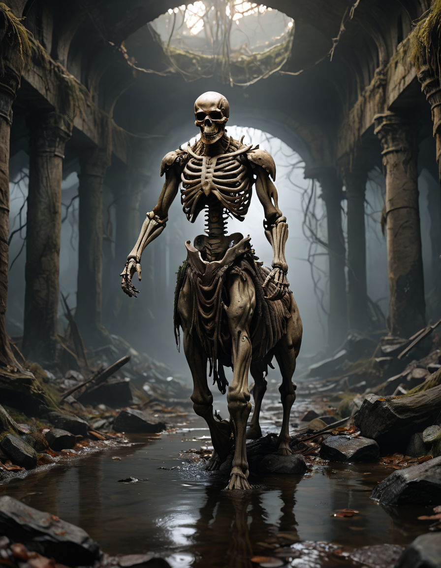 horror-themed horror style short photo of epic rooted male centaur warrior (skeleton),vanguardism oil painting, Epic and monumental, A sprawling underground labyrinth, filled with traps, puzzles, and hidden treasures, softbox, environmental light,masterpiece,decay,dead,moonlight,mist,(rusted iron armor),rugs,<lora:RPGCentaurXL:0.5>, . dark, eerie, gothic, macabre . eerie, unsettling, dark, spooky, suspenseful, grim, highly detailed