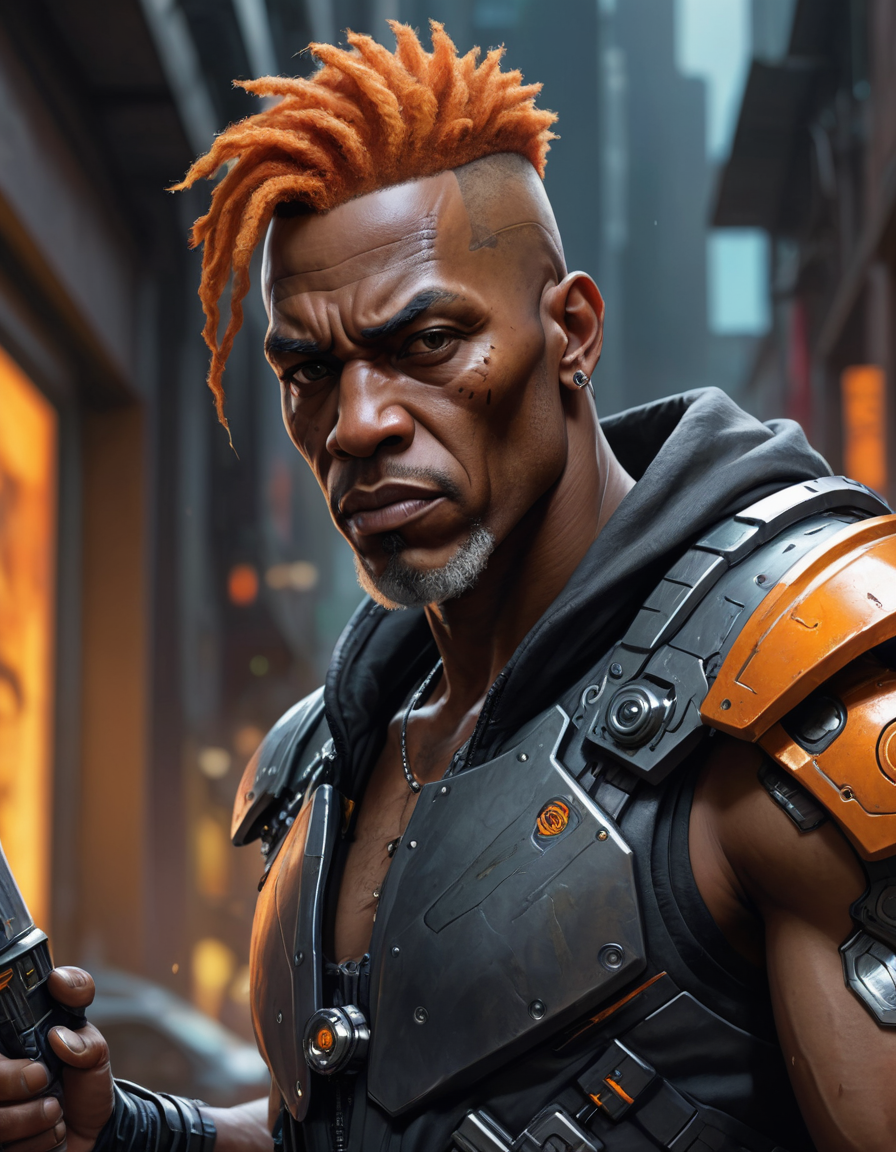 (a close up portrait facing the camera) (((Cyberpunk)) A Athletic old Cyborg black man with orange hair in a High Top Fade with smells bad and very wrinkled they are a ((Runner)) holding a sword with a background of Augmented Reality Museum Shadowrun, Neuromancer, world of Warcraft, game art, concept art digital painting,