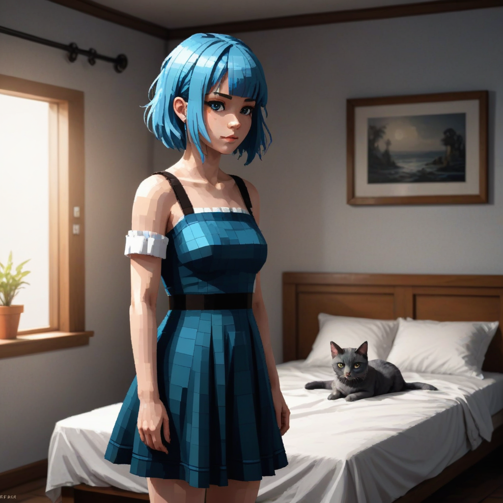 (a pixelart 2d pixel art, 2d:1.8) girl with a blue hair standing near the bed in front of 16" (anime woman wearing dress ) and holding her pet cat cutely by krenz cushar noveau!!!!!!!!!! pixelb dead space dark concept sketch sharp focus very detailed intricate elegant smooth digital illustration portrait design unreal engine 5 8k ultra hd image floating