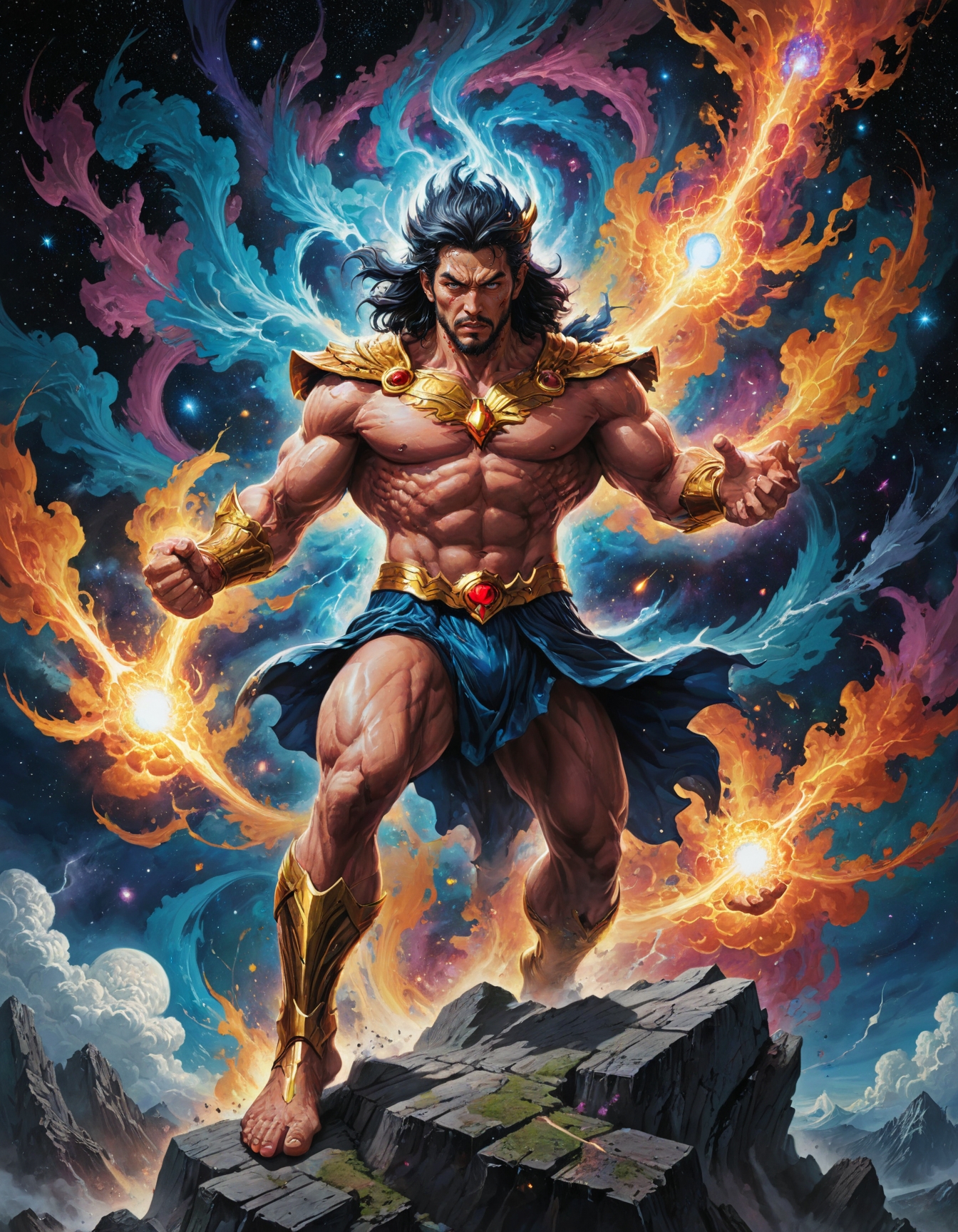 (by Go Nagai:1.5), Zeus, wielding thunderbolts, majestic, powerful, atop Mount Olympus, (Cosmic psychedelia, swirling galaxies, vibrant colors, fractal patterns, surreal landscapes, mind-bending geometry, celestial beings:1.3) <lora:xl_more_art-full_v1:0.5> <lora:add-detail-xl:1> <lora:RMSDXL_Creative:2>