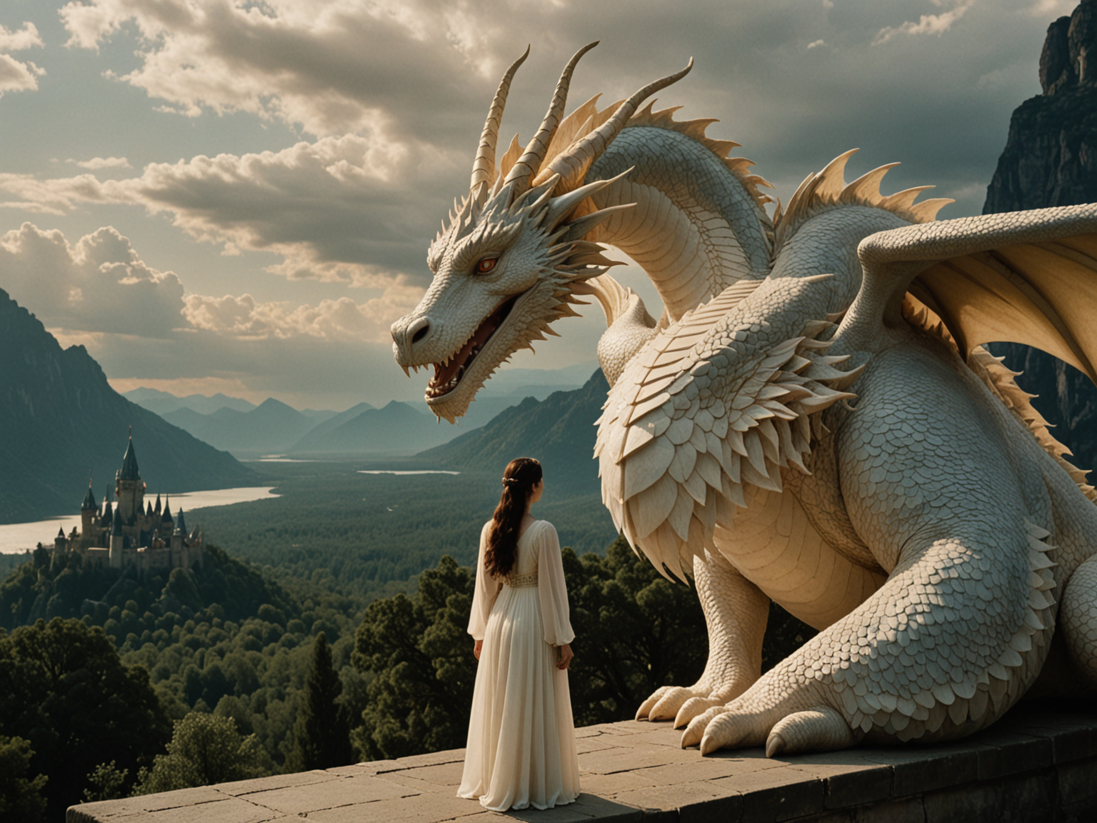 Shot on Kodak Vision3 500T film with a 35mm Panavision PSR camera and a Panavision Ultra Speed Prime 50mm f/1.2 lens, this captivating filmstill captures the Childlike Empress from "The NeverEnding Story" standing alongside the majestic Luck Dragon, Fuchur, before the iconic ivory tower. Fuchur, with his luminous white scales and gentle demeanor, embodies a sense of ancient wisdom and protective presence. The Empress and Fuchur share a moment of silent communication, their bond evident as they stand together in the magical realm of Fantasia. The ivory tower, reaching skyward with intricate carvings and shimmering spires that seem to touch the clouds, dominates the background. Its walls bear the echoes of countless tales and the weight of centuries, exuding an aura of mystery and enchantment that beckons viewers to explore its timeless corridors and hidden chambers. The combination of the Empress, Fuchur, and the awe-inspiring ivory tower creates a scene that encapsulates the magic and wonder of "The NeverEnding Story," inviting viewers to embark on a journey through the fantastical world of Fantasia.