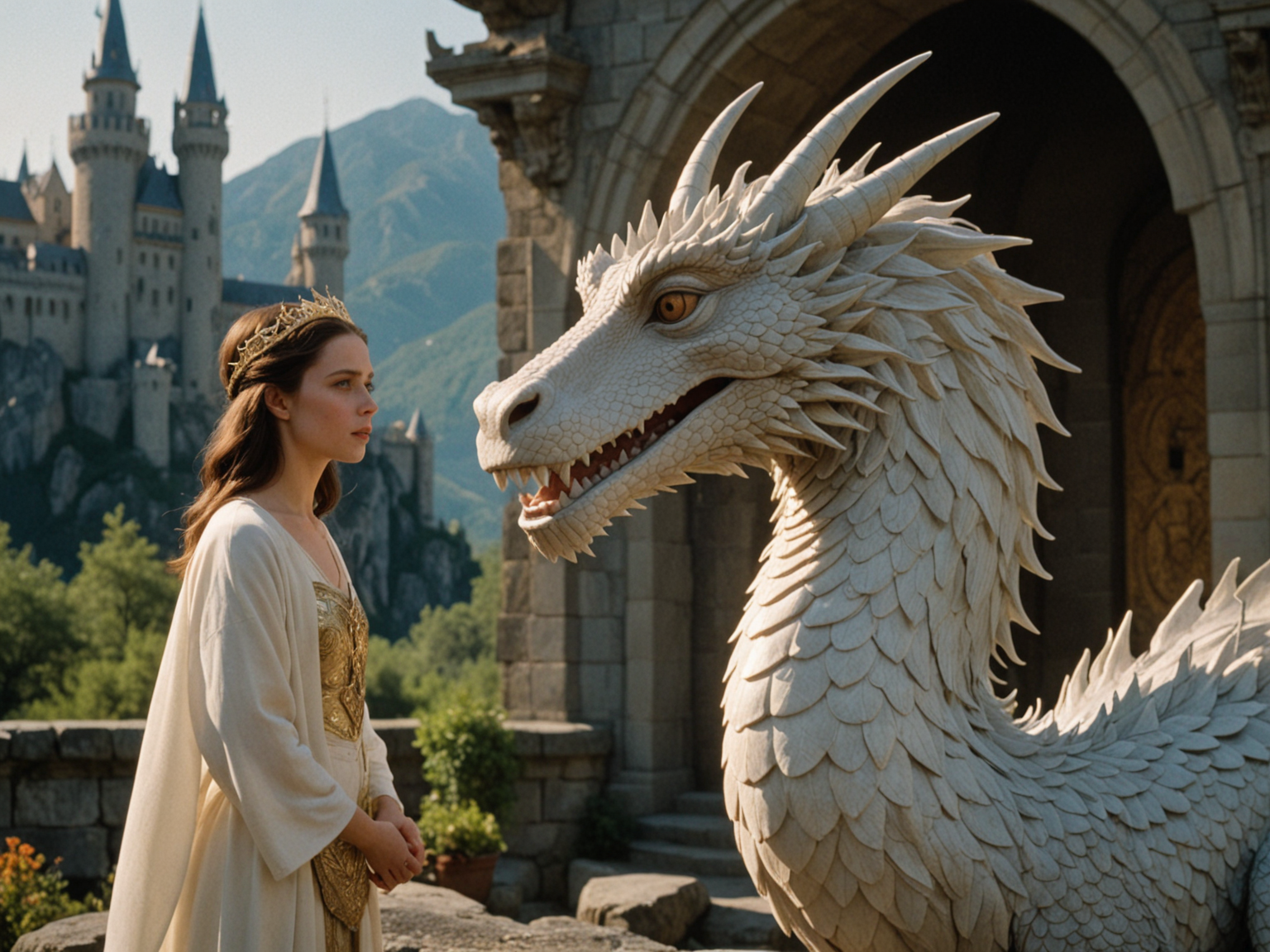 Shot on Kodak Vision3 500T film with a 35mm Panavision PSR camera and a Panavision Ultra Speed Prime 50mm f/1.2 lens, this captivating filmstill depicts the Childlike Empress from "The NeverEnding Story" standing alongside the majestic Luck Dragon, Fuchur, before the iconic ivory tower. Fuchur, with his luminous white scales and gentle demeanor, embodies a sense of ancient wisdom and protective presence. The Empress and Fuchur share a moment of silent communication, their bond evident as they stand together in the magical realm of Fantasia. The (ivory tower:1.5) looms in the background, adding to the enchanting atmosphere of the scene and inviting viewers to embark on a journey through the fantastical world of the NeverEnding Story.