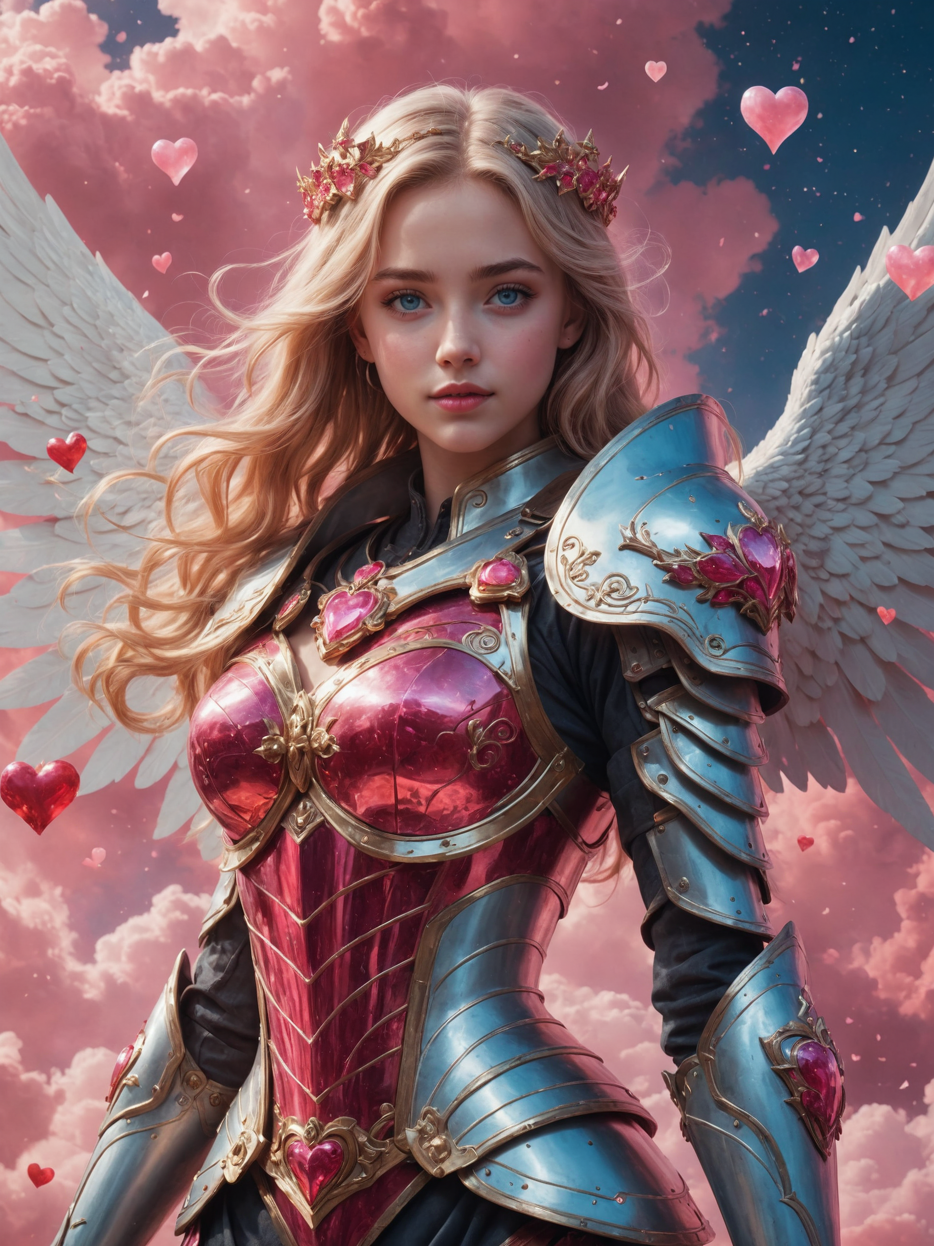cinematic film still, complex love shape armor, blue eyes, smile, love clouds, pink clouds, (intense love light:1.1), realist detail, brooding mood, ue5, detailed character expressions, light red and white, amazing quality, wallpaper, analog film grain, 1girl, adult woman, blue eyes, long blonde hairstyle, full of love, fighting pose, extreme detailed cloudy background full of love hearts, ((full body)), love hearts around, glowing hearts, solo, detailed background, ((HolyFantasy:0.8), love fantasy theme), holy healer sorcerer, red lips, smile, very complex ruby heart shape armor, ruby heart shape crystal armored wings, red ruby heart shape crown, dynamic pose, ruby color scheme, golden flames in background, symmetrical composition, cinematic atmosphere, very complex pink background full of power, cosmos and stars on background, energetic pink nebula and galaxies imploding <lora:add-detail-xl:0.4>