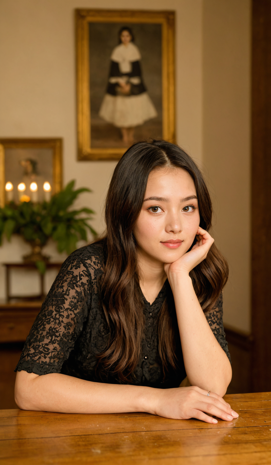 (Groundbreaking Painting:1.3) of (Cel shaded:1.3),(Proud:1.3),(by Artist Jan Hendrik Weissenbruch:1.3), (((masterpiece))), (((best quality))), 24 y.o Chinese woman, solo, 1980's, , flowers art stylized by Mary Fedden and Edward OkuÅ and Alex Hirsch, primitivism art, 1980'S (elegant:1.3) , detailed with [Linen:Vines:5] details, woods, Moon in the night, Awe, F/1.8, key visual, big eyes, (pale-skin:1.1)