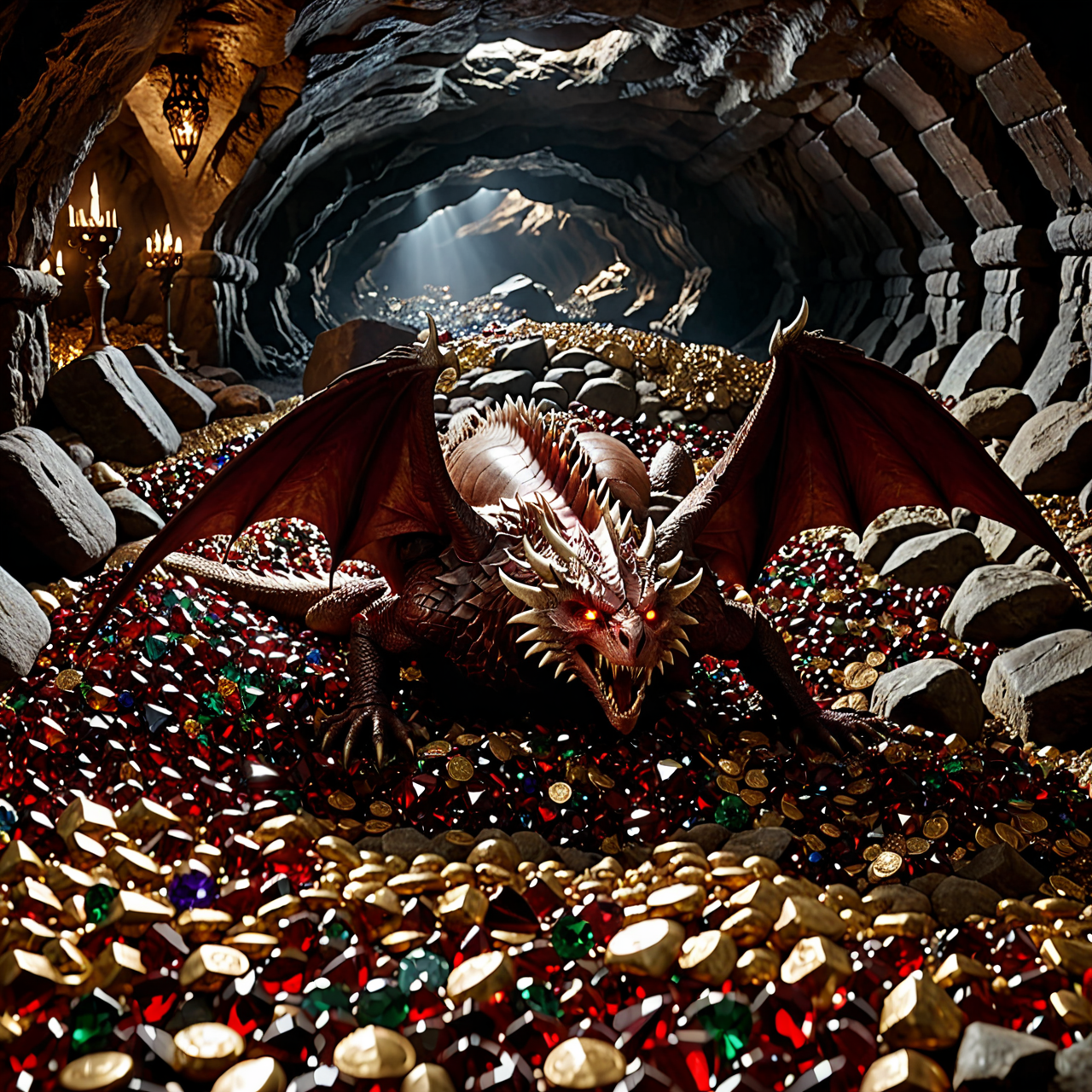 cinematic film still Birds eye view ((far Distant shot)), The abandoned dwarven mines of Erebor, full body shot of the fierce winged dragon Smaug, sleeping with one eye open,((in a spacious cavern )),on a giant pile of ((gems, jewels)), gold coins and ((treasure )),exquisite lighting, Rembrandt Lighting Style , ruanyi0005 , shallow depth of field, vignette, highly detailed, high budget Hollywood film, cinemascope, moody, epic, gorgeous,