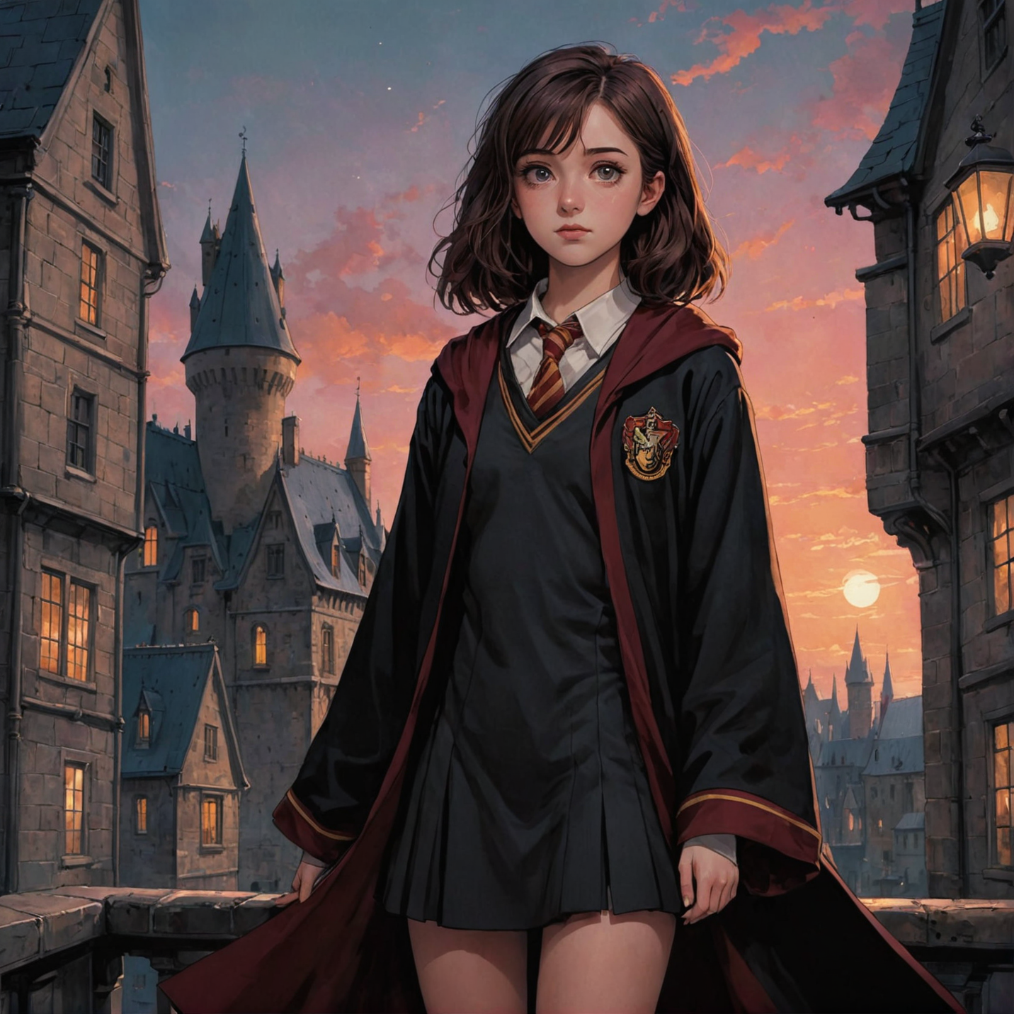 anime art, anime coloring, a girl wearing a gryffindor uniform with black robe, hogwarts, low angle, muted colors, dark palette, hazy twilight, (looking away, looking far:1.3) <lora:harry_potter_v1:1>