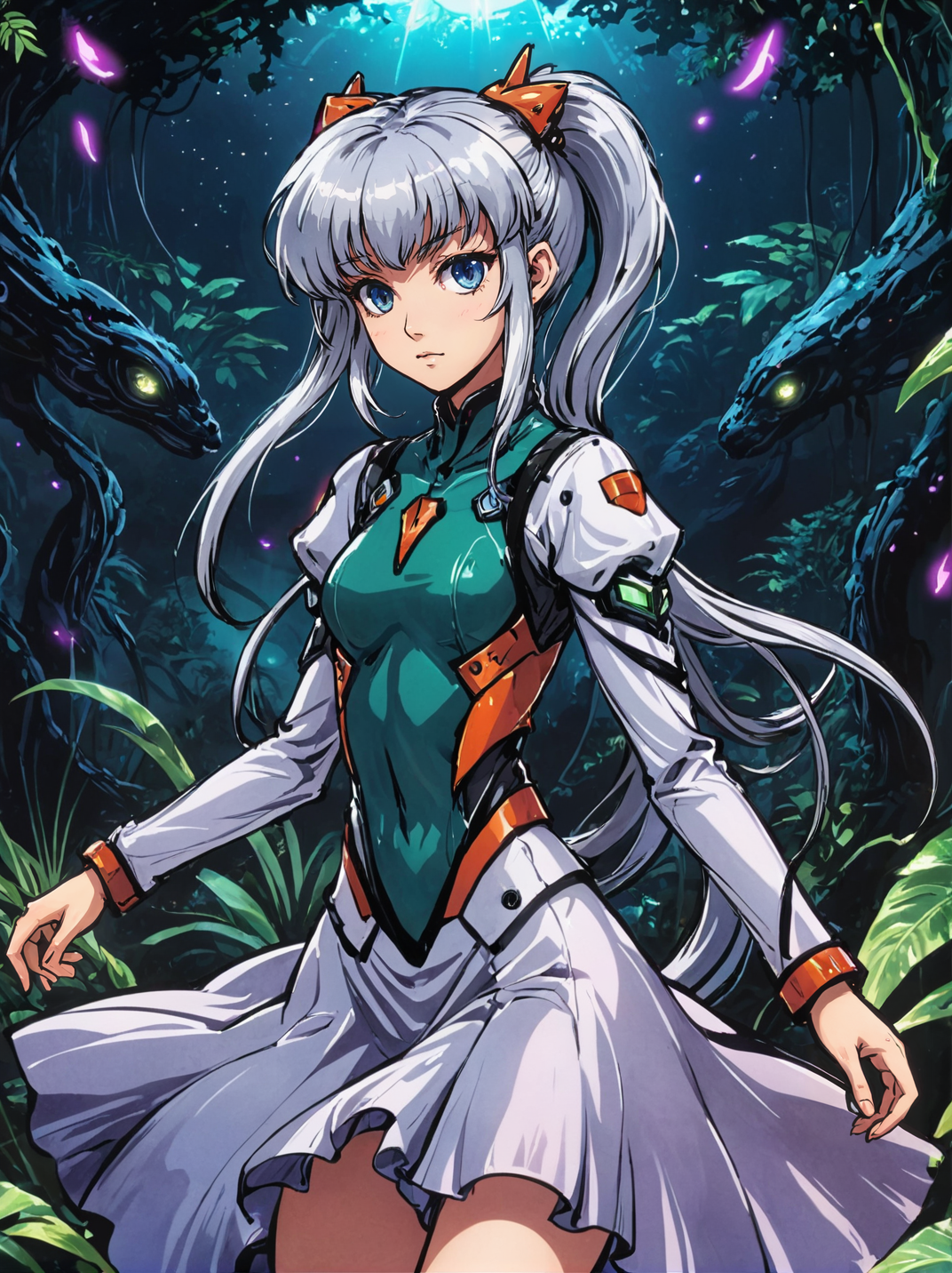 artwork by tokiame, blunt bangs, high ponytail, silver hair, pointy ears, in the depths of a bioluminescent alien jungle, [evangelion:cyberpunk edgerunners:0.5], reflective transparent iridescent opaque clothing, long sleeves, flowing dress, long skirt, very aesthetic, highres, 4k, 8k, intricate detail, cinematic lighting, amazing quality, amazing shading, detailed Illustration, official artwork, wallpaper, official art, extremely detailed eyes and face, beautiful detailed eyes, from below, full body, thigh gap, , masterpiece, best quality <lora:tokiame_xl_v1:1>