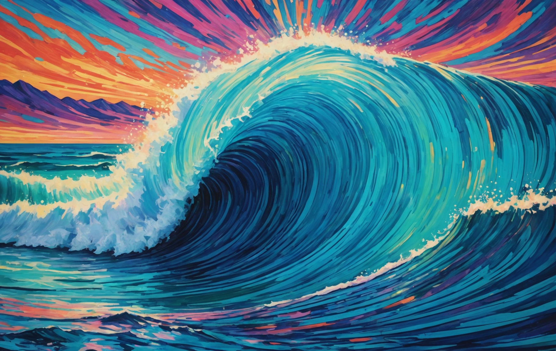 A tidal wave oscillating between ocean blue and turquoise energy states, in Holographic Fauvism style, with quasar flares