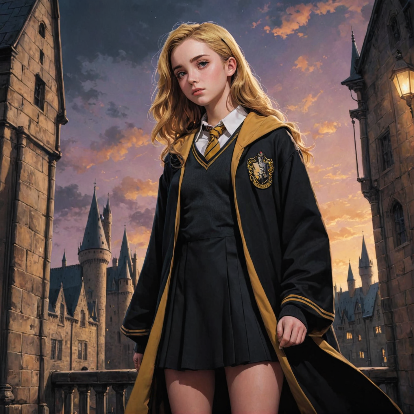 anime art, anime coloring, a girl wearing a hufflepuff uniform with black robe, hogwarts, low angle, muted colors, dark palette, hazy twilight, (looking away, looking far:1.3) <lora:harry_potter_v1:1>