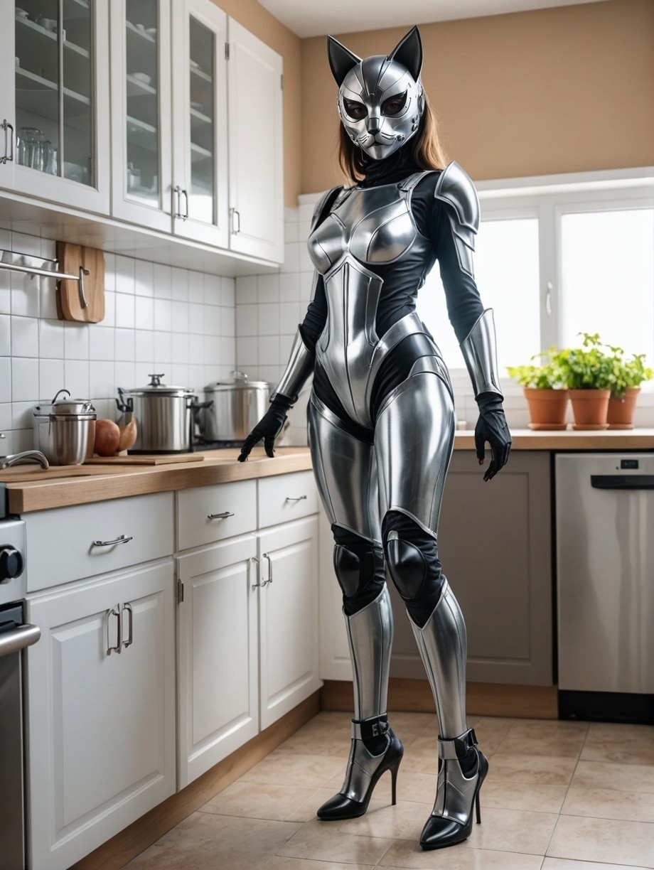 slim fit young girl in tight elegant light power armor cat mask heels on kitchen