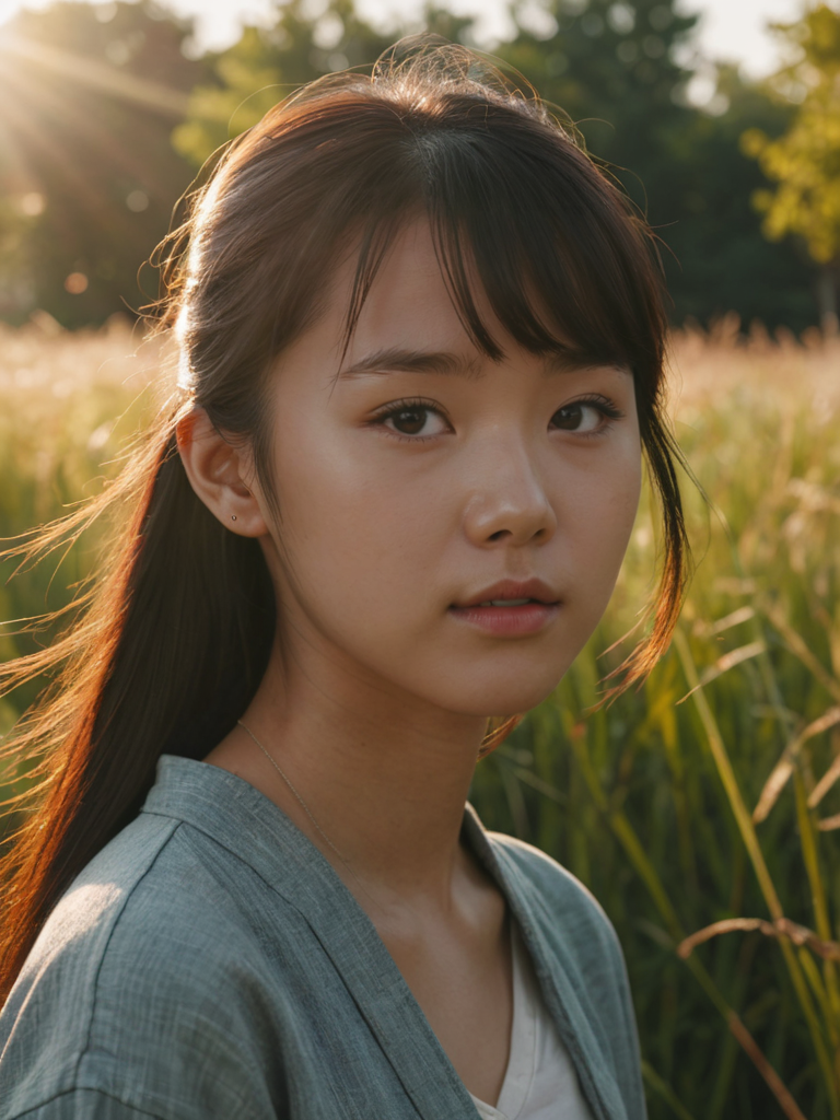 Film film still, close-up, photo of an 18-year-old Chinese girl near the grass, fictional scenery, (intense sunlight: 1.4), realistic details, contemplative emotions, ue5, detailed character expressions, light amber and red, amazing quality, wallpaper, simulated film particles, <lora:sd_xl_dpo_lora_v1:1>,