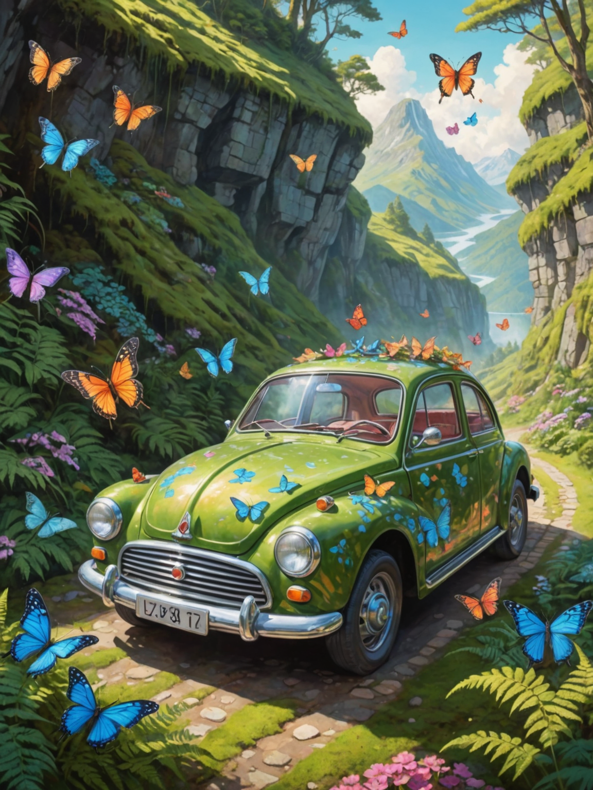 A vibrant illustration of a whimsical, bubble-shaped car, adorned with holographic butterflies, navigating a winding mountain road carved into ancient, moss-covered rocks. Sunbeams glint off the car's surface, casting playful shadows on the surrounding ferns and flowers.