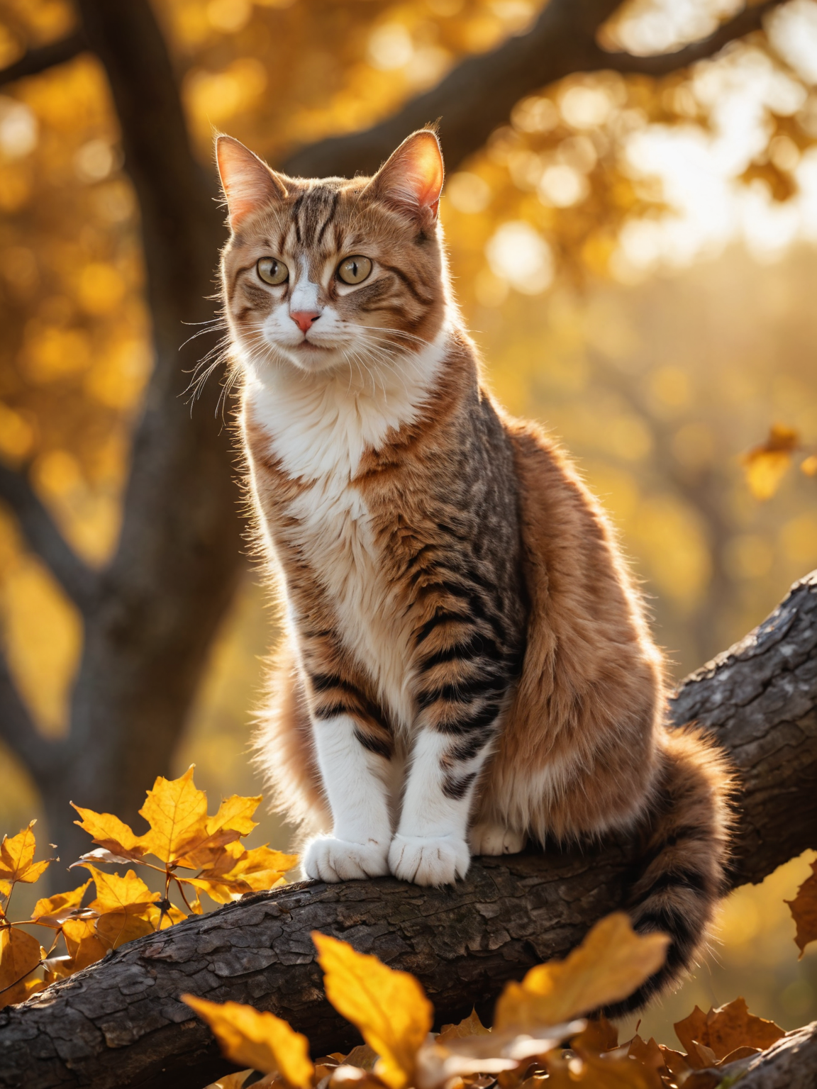 photo of a Cat poised gracefully atop an ancient oak tree, autumn leaves fluttering around, golden hour casting long shadows, backlit, sharp focus on feline, bokeh effect on background foliage, digital painting.