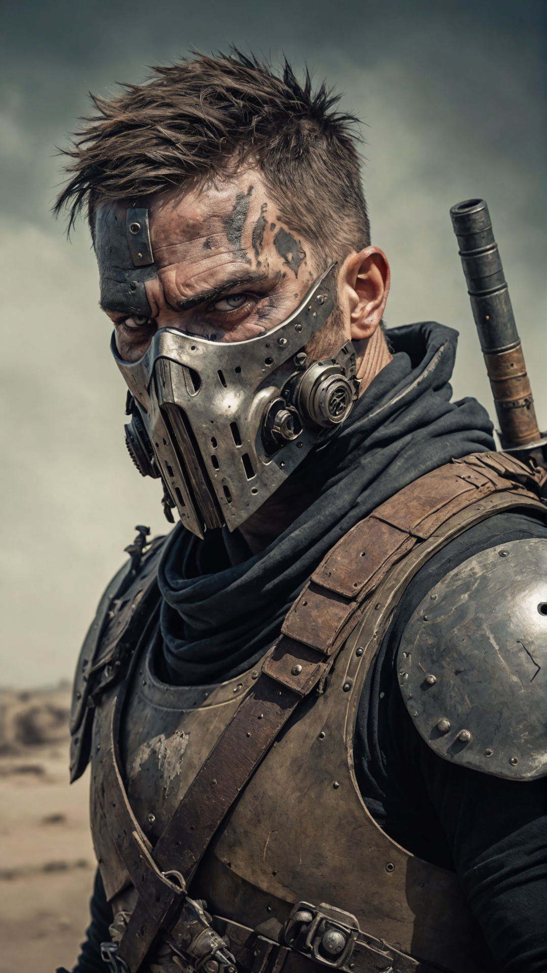 A portrait of a post-apocalyptic warrior with battle scars,Wearing half a mask,armor,and weapons,standing in a desolate wasteland,in a detailed digital painting with gritty textures,inspired by the Mad Max franchise.,<lora:more_details>,