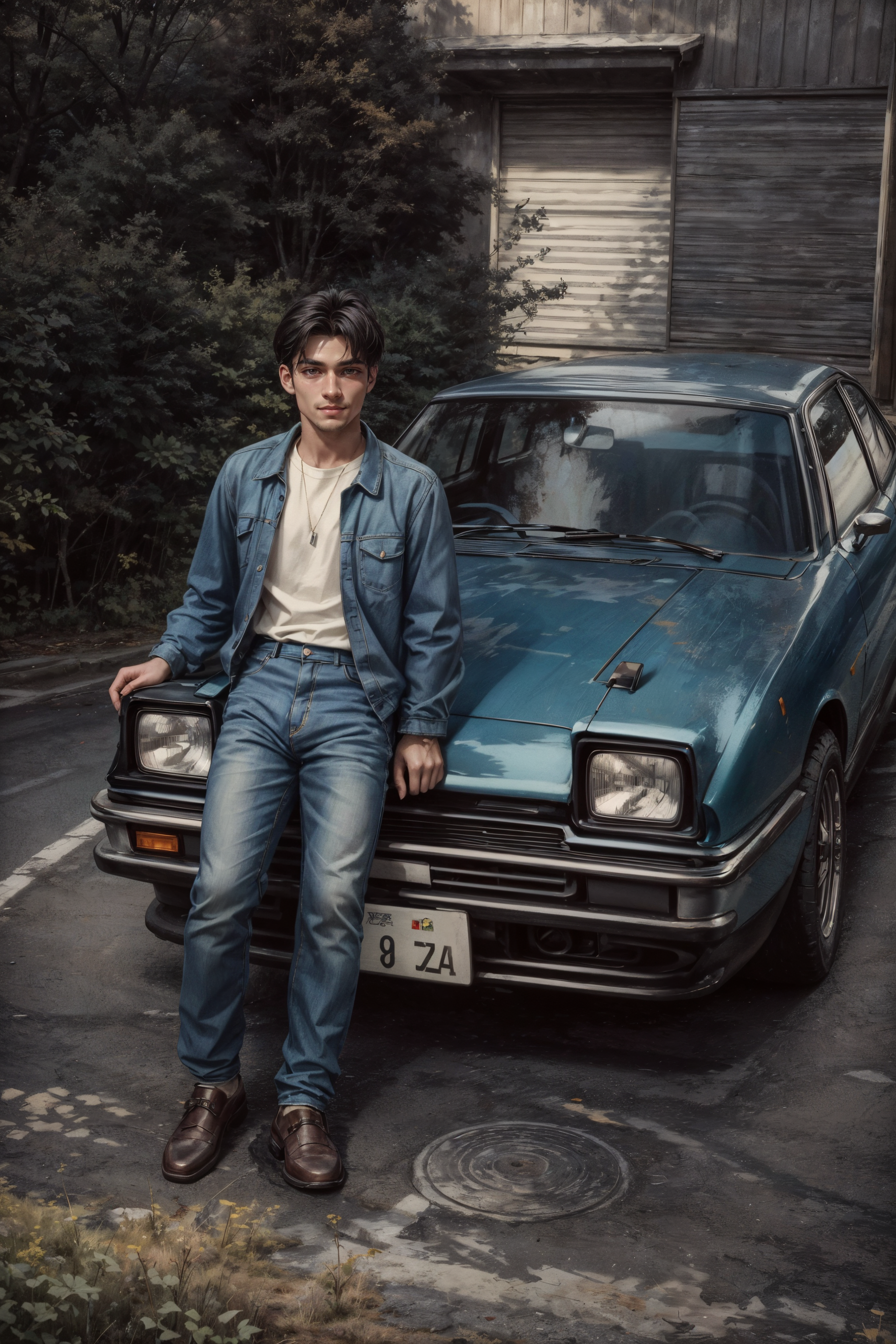 (best quality, masterpiece:1.1), highly detailed, photorealism, photo-realistic, high contrast, (photorealistic:1.1), vehicle focus, car focus, 8k high definition detailed realistic, photon mapping, radiosity, physically-based rendering, extreme good quality, soft lighting, ({white | black | green | red | yellow | blue} (widebody 90's JDM car:1.1)), outdoors, on the street, widebody, zeekars, BREAK man leaning on the car