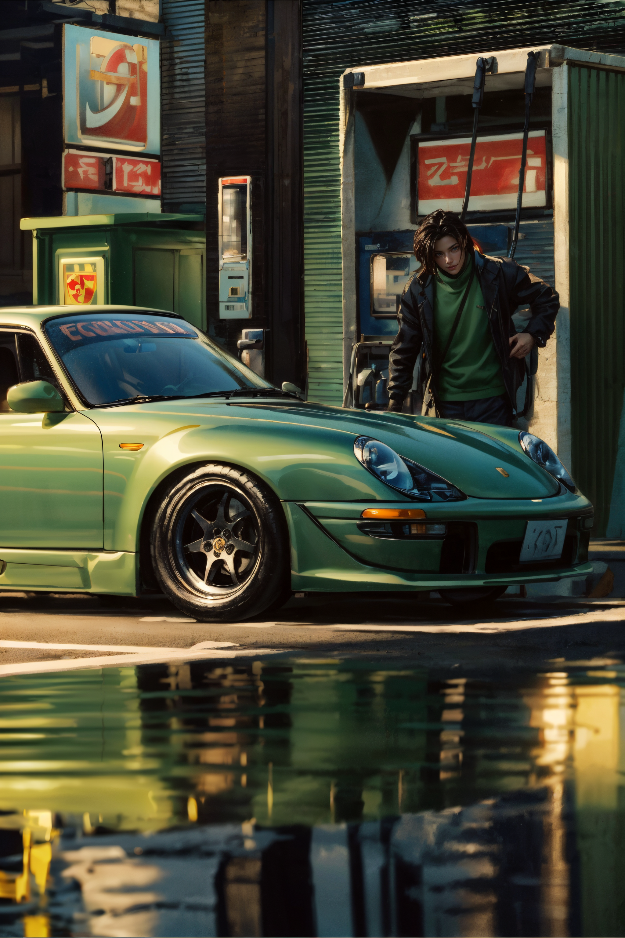 (best quality, masterpiece:1.1), highly detailed, photorealism, photo-realistic, high contrast, (photorealistic:1.1), vehicle focus, car focus, 8k high definition detailed realistic, photon mapping, radiosity, physically-based rendering, extreme good quality, soft lighting, ({white | black | green | red | yellow | blue} (widebody 90's JDM porsche car:1.1)), outdoors, at the gas station, widebody, BREAK man standing next to the car