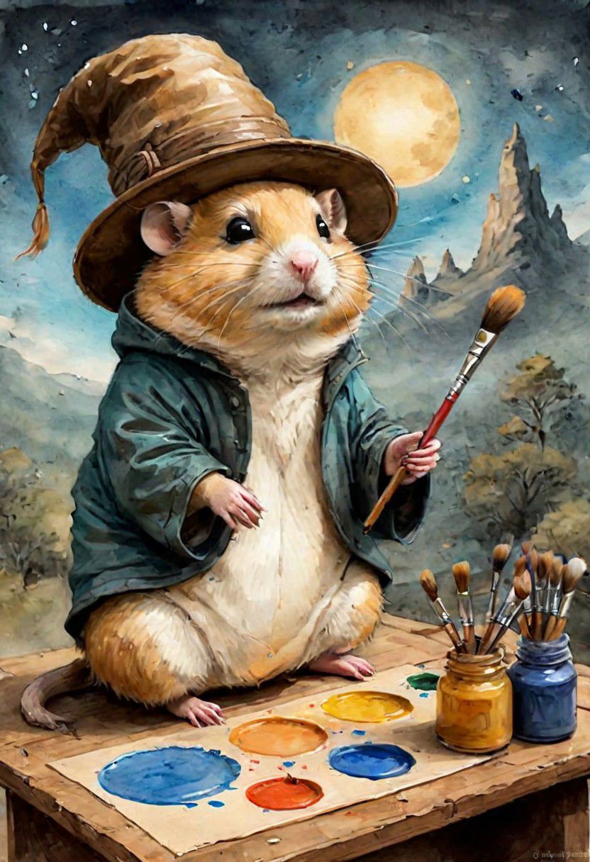 old book style ink illustration, on parchment, ink splashes, ink stains, ink smears, faded ink, chubby Dzungarian hamster in an adventurer's hat, (((Paints a portrait of giaconda, palette, brushes, model,))), view from below, atmospheric dreamscape painting, dream scenery art, highly detailed visionary art, cgi style, vibrant oil painting, splash art, Cozy mystery, masterpiece 8k wallpapper, neoplasticism, Unreal Engine, dramatic lighting, coat, pantless, linquivera, liiv1, on parchment