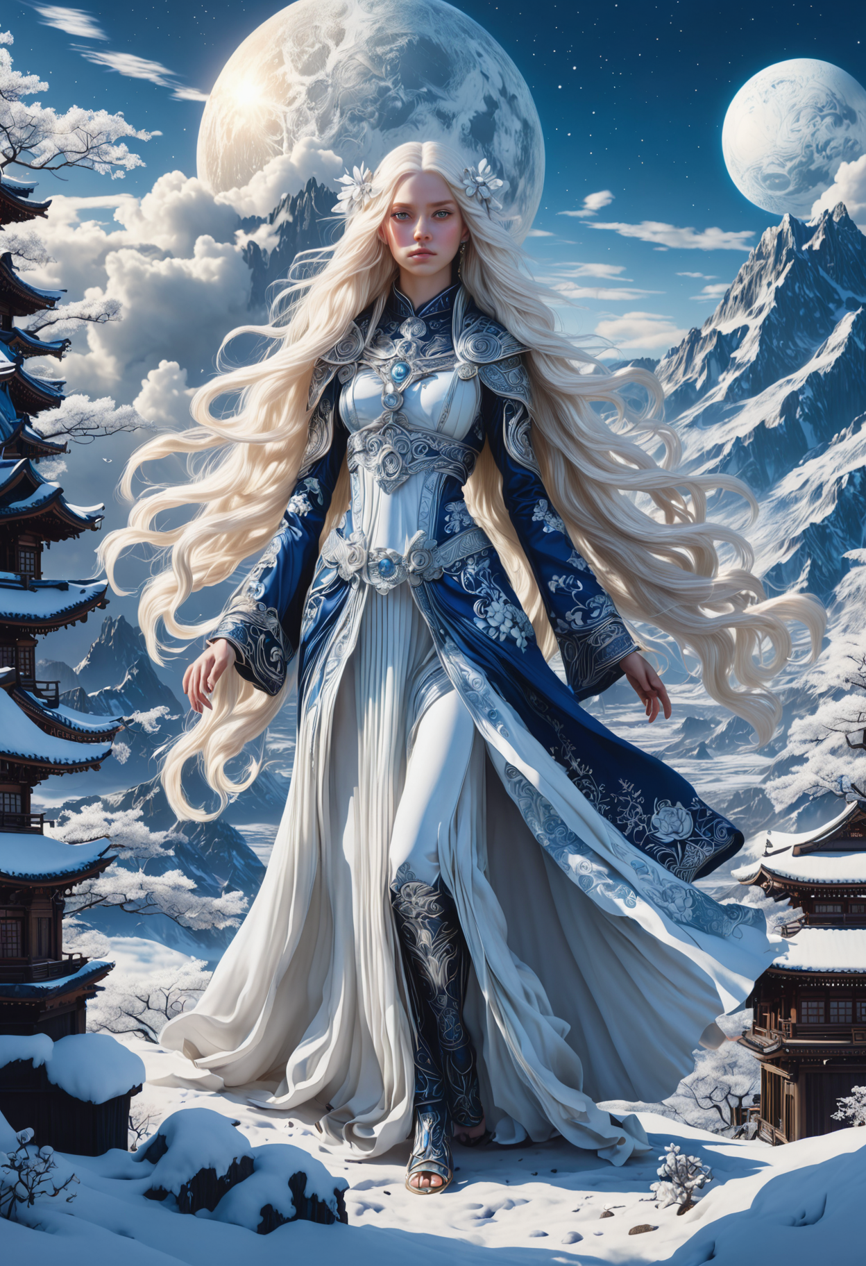 celestial landscape, nanobots,long shot DonMM1y4XL woman, japanese ukiyo - e, mythpunk, dismal, parallax mapping, redengine engine, romanticist, polaroid transfers, bird's eye view, snow, crisp details, ultra-high resolution, trailblazing, sarcasm #dynamic range, f/11, shutter speed 1/8 sec, iso400, white balance fluorescent, exposure compensation "-3.0 ev", manual shooting mode, framing, focus mode single, center-weighted metering", <lora:released\DonM3t3rn1tyXL-v1.1-000008:0.6>,<lora:myLora\DonMM1y4XL-v1.1-000008>