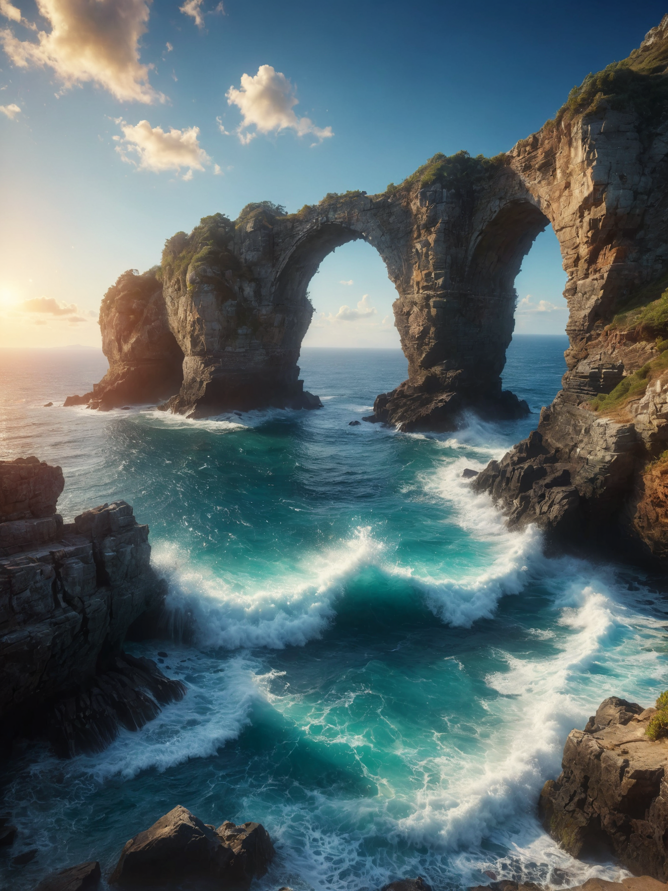 Breathtaking art in the style of Tite Kubo, a world where shadows are portals to parallel universes, stone arches along a rugged coastline, iridescent lighting creates a luminous effect. <lora:ral-dissolve-sdxl:1>, (HDR, High Dynamic Range, vibrant colors, high contrast, detailed, UltraHD, 8K, cinematic, 80mm, high detail)