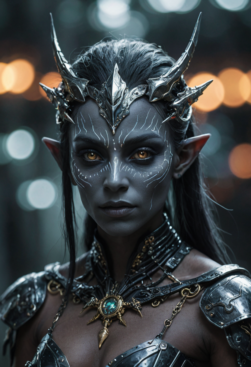 A portrait of a cyber mechanical dark elf queen, cinematic, melancholy, dynamic lighting, bokeh, aurora, 35mm photograph, film, bokeh, professional, 4k, complex detail, film grain, noisy, chromatic aberration, <lora:xl_more_art-full_v1:0.5>, <lora:add-detail-xl:0.3>