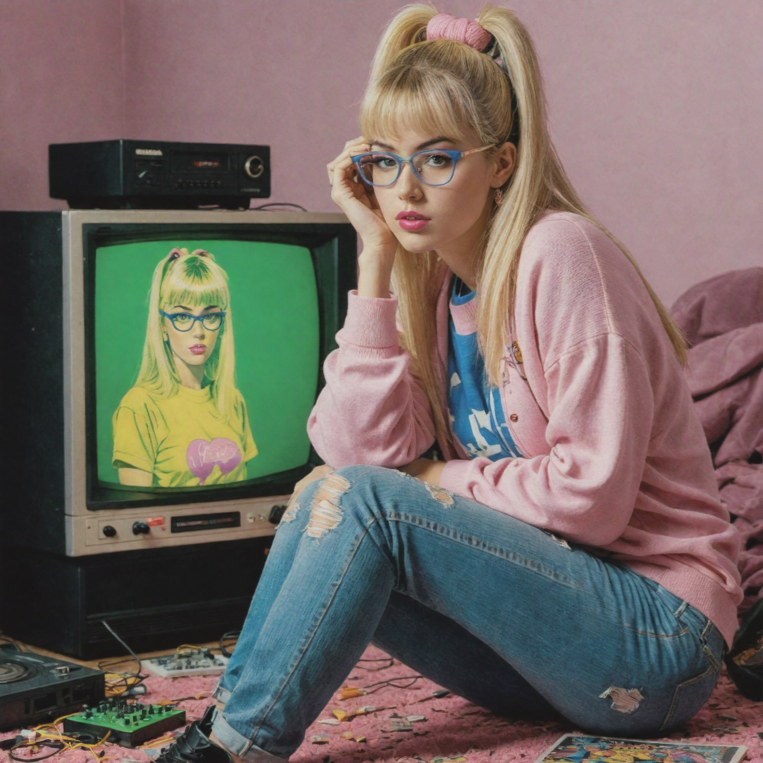 80's poster art in a hand-drawn (illustration) by (Simon Bisley:1.2) (Milo Manara:1.5) (comics art:1.5) art style. Depict a young, (nerd), and goofy geek (gamer girl) in the 1980s with a slim, fit, and slender figure, along with firm breasts. She is immersed in her bedroom in front of a (computer) at (night), playing retro games, a glowing screen from the computer casting a soft green light on her face. The room is adorned with [heavy metal] band posters, painted in neon colors, clothes scattered on the ground. The girl wears a pink sweater and bright blue jeans, nerdy big eyeglasses. Her blonde ponytail hair is adorned with alluring makeup, captivating blue eyes, an upturned nose, a delicate jawline, and parted pouty full lips with pink lipstick. <lora:Wiz-VintageComicBookCover_v01:0.8>