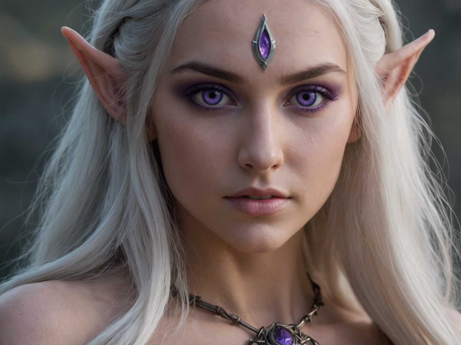 photo of young elf woman, a seductive wizard with long white hair and purple eyes, beauty, beautiful breasts and sexy face, cinematic film still, from Dungeons & Dragons