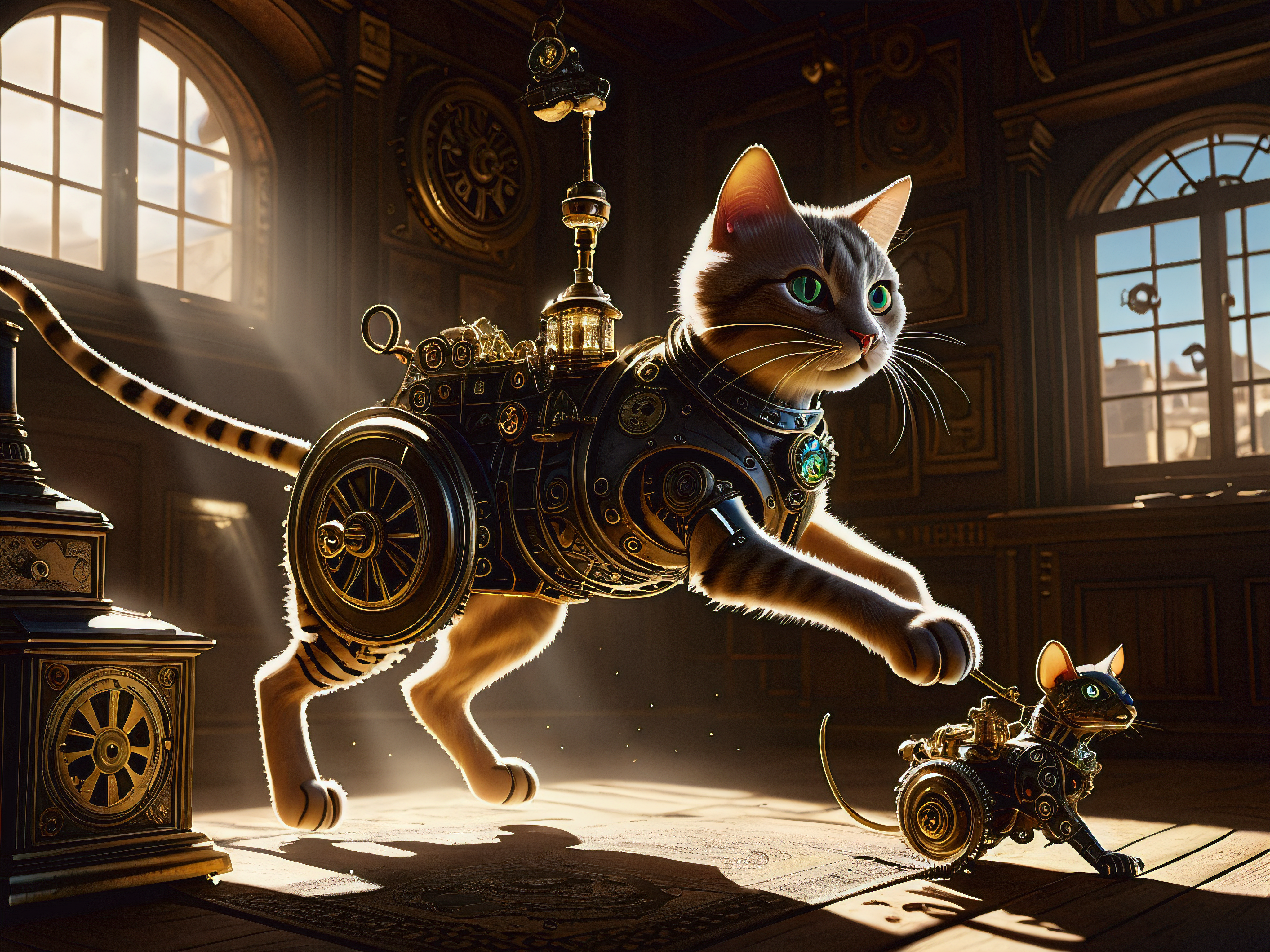 digital art, masterpiece, highly detailed, steampunk mechanical cat chasing a steampunk mechanical mouse, lots of gears, through a dusty old house, shafts of light illuminate dust floating in the air, <lora:add-detail-xl:0.6>,