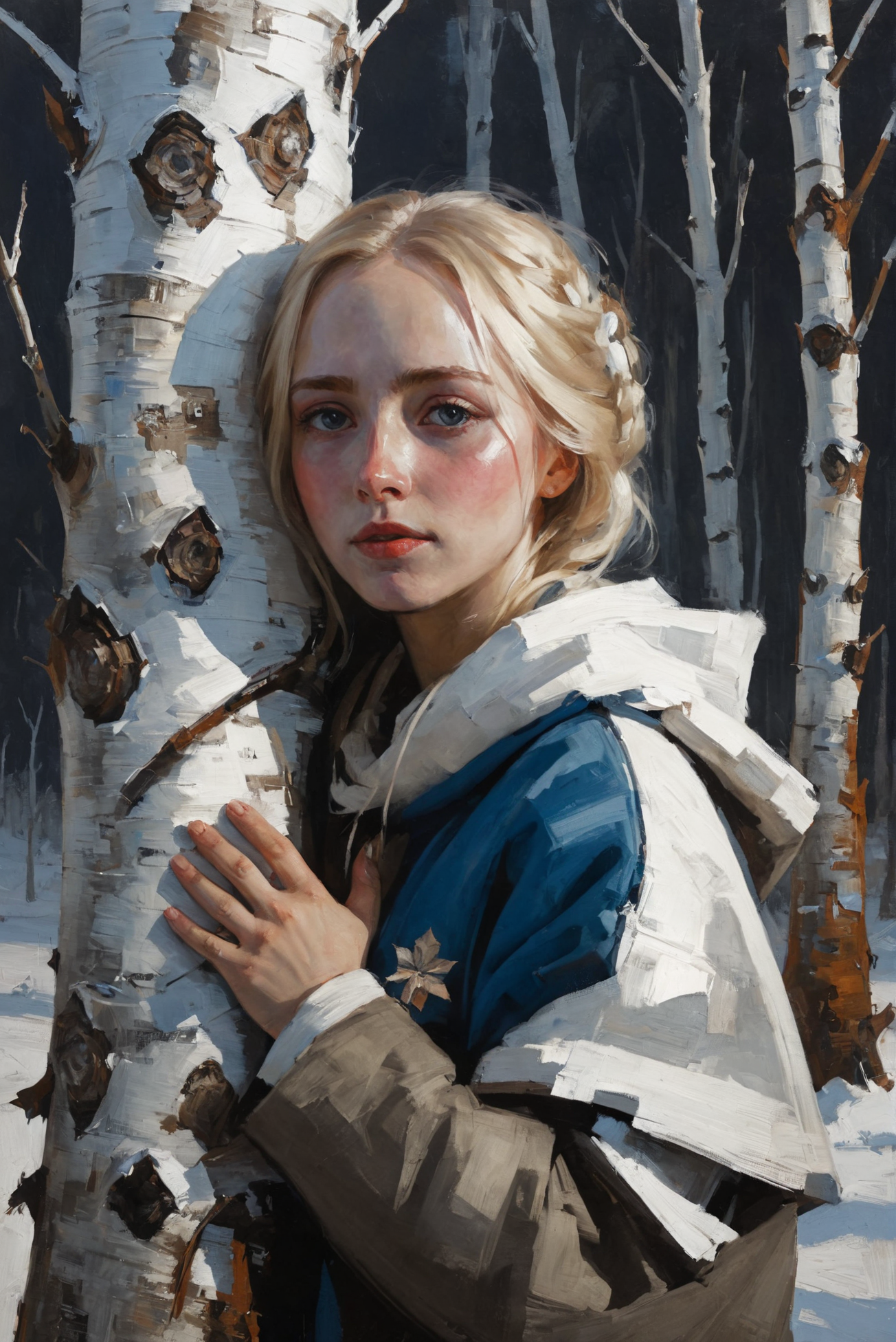 A young Russian woman hugs a birch tree, blond, (blue eyes:0.5), trad russian clothes, winter (oil painting:0.1), white theme, in Nicola Samori style, disco Elysium, backlighting, warm light, <lora:add-detail-xl:1> <lora:NicolaSamori:0.8> <lora:DiscoDeliriumXL-v1.2:0.6> <lora:xl_more_art-full_v1:0.1>, (best quality, 8K, high resolution, extreme detail, outstanding composition:1.4),