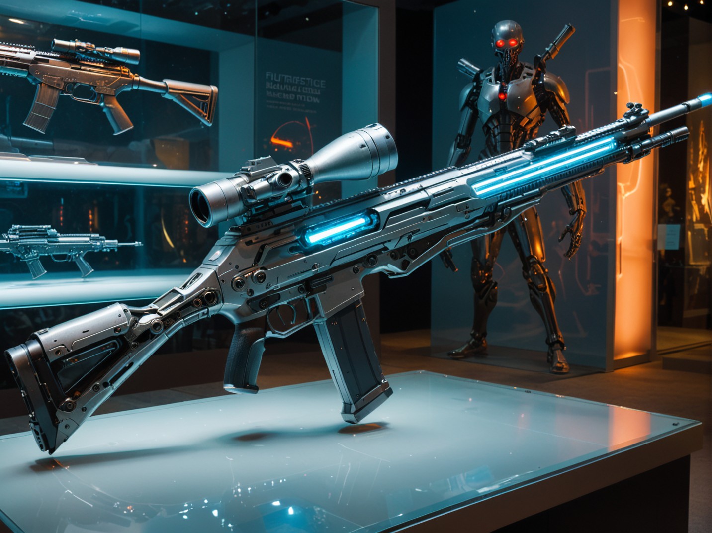 futuristic 2145 year rifle with glowing parts electromagnetic science fiction weapon on display in museum <lora:SDXL DET more_art-full_v1:0:hr=1>