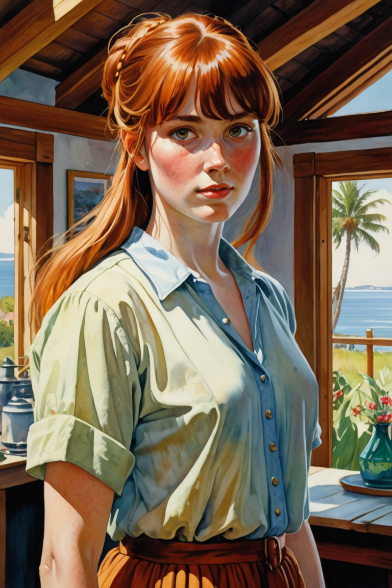 grand Water color painting, highly detailed, soft focus of a Young Holy Female Dockworker, ð¤ , the Female has Auburn hair styled as Bangs, inside a Cottage, Very wide view, Classical, Manic, spotlight, Polychromatic, [ (art by Peter Elson:0.9) , (Sparth:0.9) ::9]