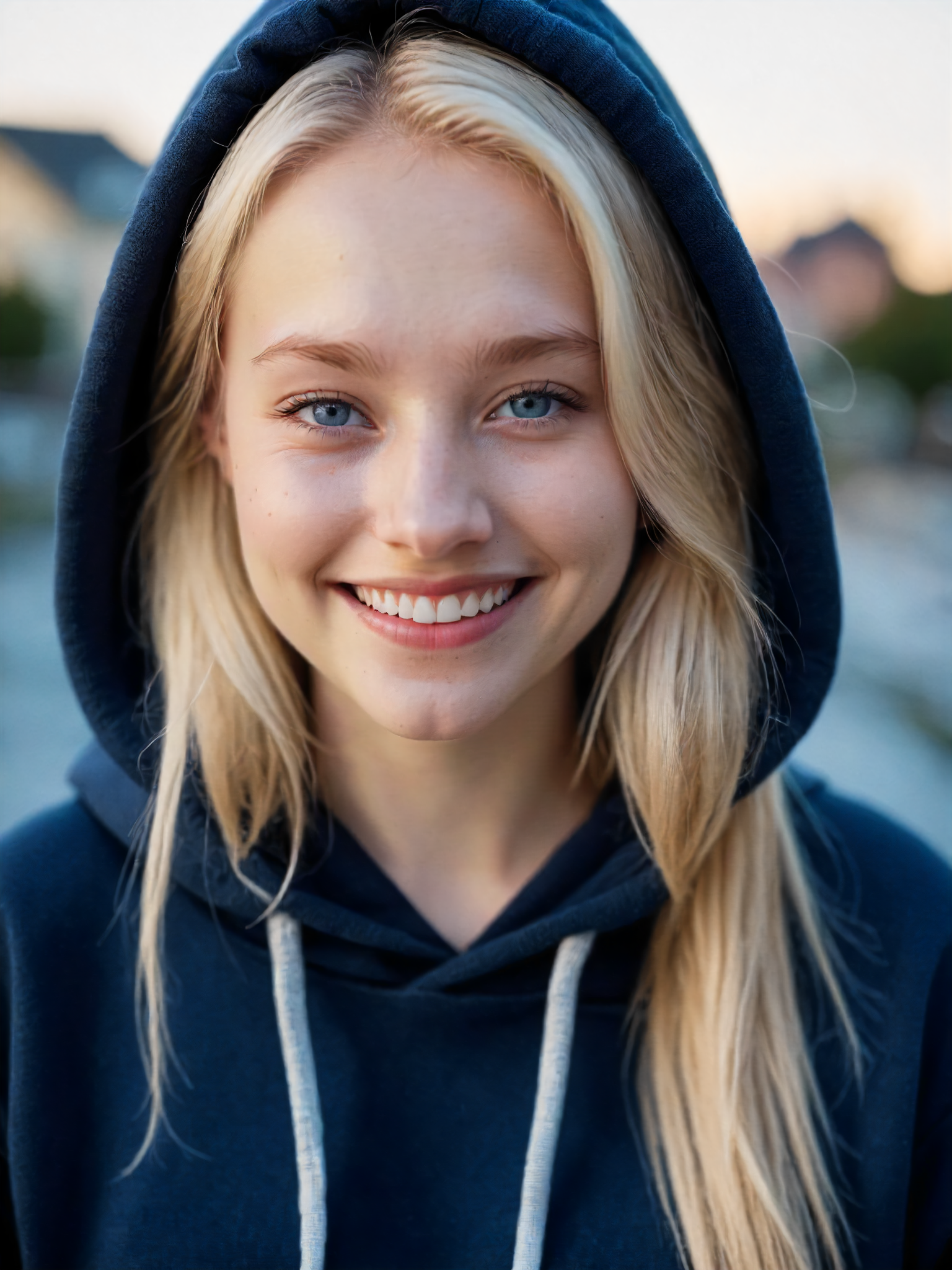 close up analog portrait photograph of a 25yo woman wearing an oversized navy blue hoodie, Scandinavian blonde hair blue eyes, casual makeup, thin|petite body, cute|beautiful face, smiling|laughing, perfect teeth, imperfect skin, bokeh, cinematic lighting, ultra realistic, sharp subject focus, dusk lighting, complex outdoor background <lora:RMSDXL_Enhance:2> <lora:sd_xl_dpo_lora_v1:1>