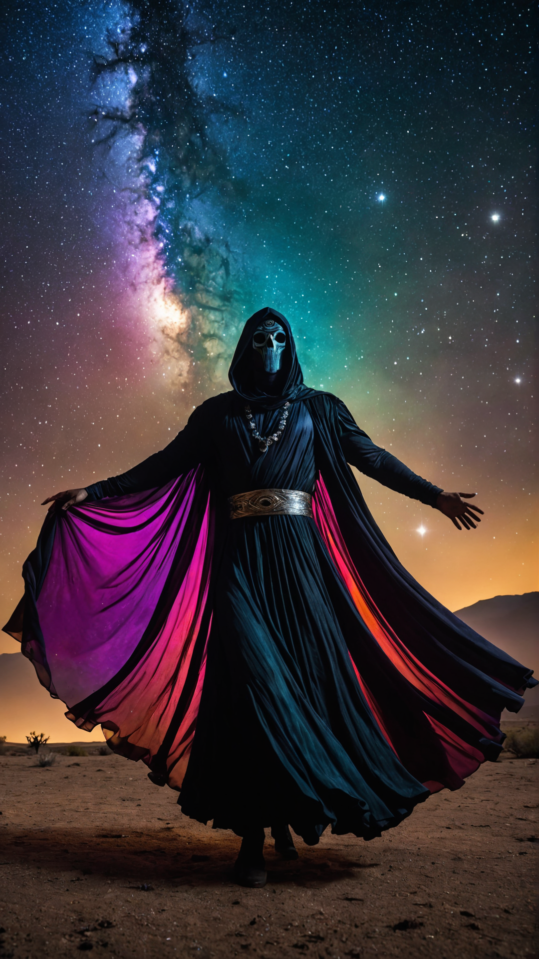 8k award winning photo of a man,(dancing (alongside:1.5) a wraith),a husk whose soul is ascending from it's body,light shining down upon them both.,a great colorful galaxy seen in the distant background,