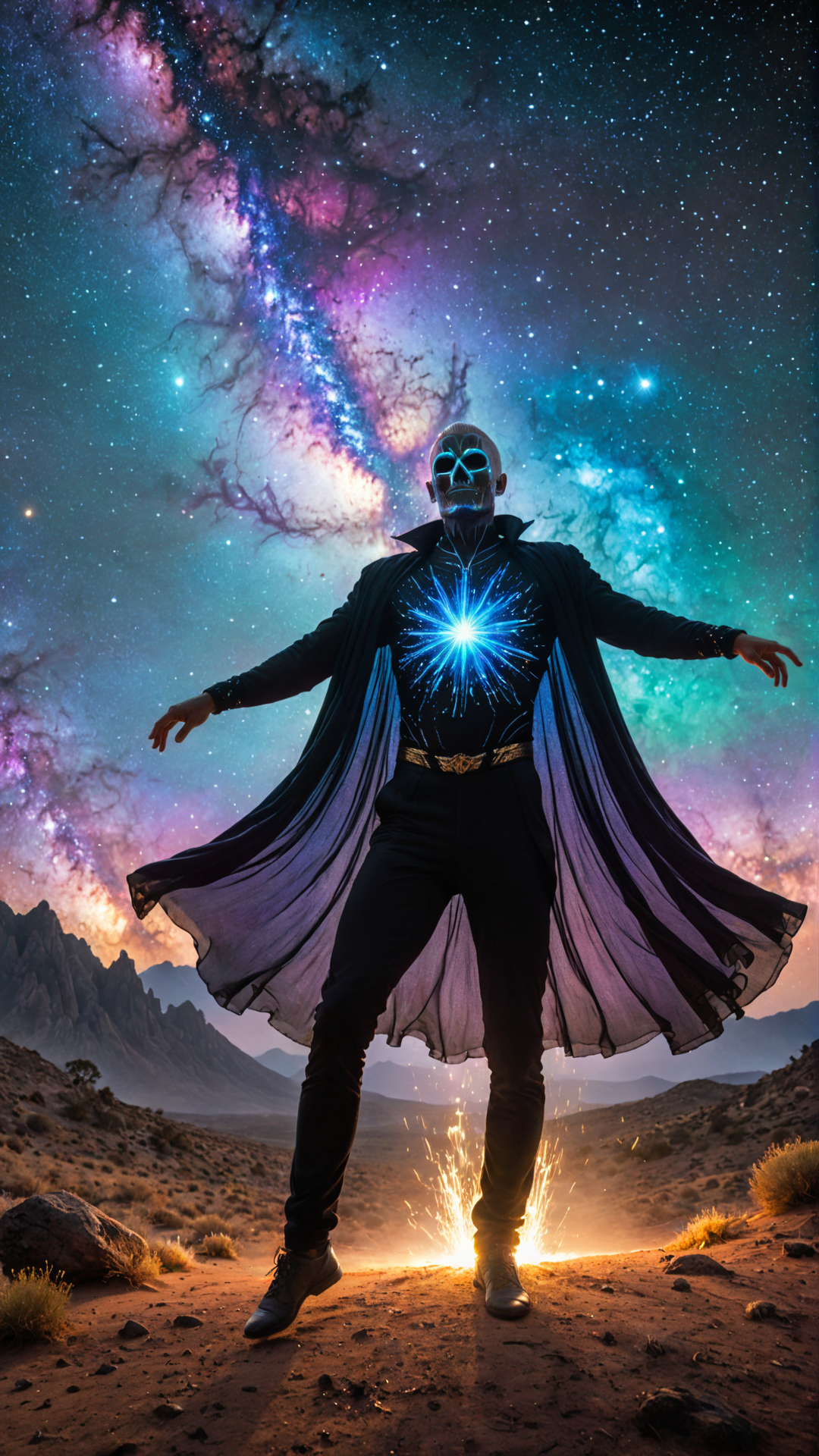 8k award winning photo of a man,(dancing (alongside:1.5) a wraith),a husk whose soul is ascending from it's body,light shining down upon them both.,a great colorful galaxy seen in the distant background,<lora:xl_more_art-full_v1:0.7>,