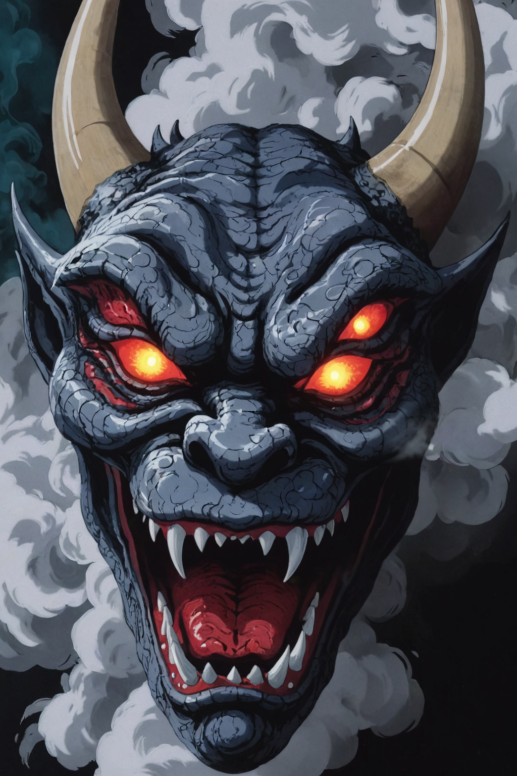 dragon oni mask, smoke, fangs <lora:xl_yoshiaki_kawajiri_v1:0.8>