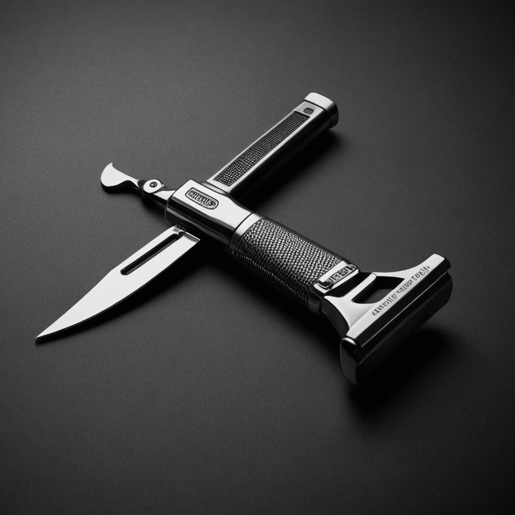 text "FANTASTIC CLEAN BEST DEAL" product advertisement picture of experimental shaving razor with dangerous sharp unsafe blades for military with knife blade at back of handle, masterpiece, best quality, high quality, highres, ultra-detailed