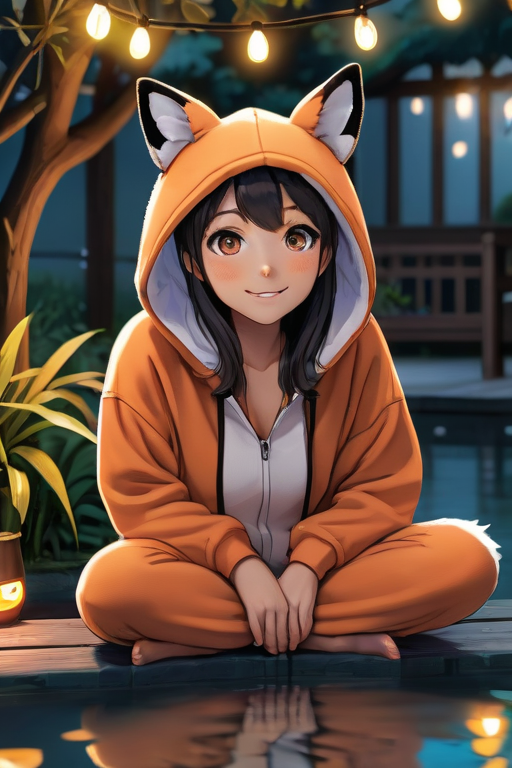 8K, sharp focus, Natural volumetric lights, soft lighting, fox_onesie, fuzzy_onesie, hood, fox_kigurumi, smiling, looking_at_viewer, symmetric_eyes, detailed_eyes, garden, sitting, feet in water, porch, backyard, string_lights in trees, night, fireflies, evening , fullbody, anime