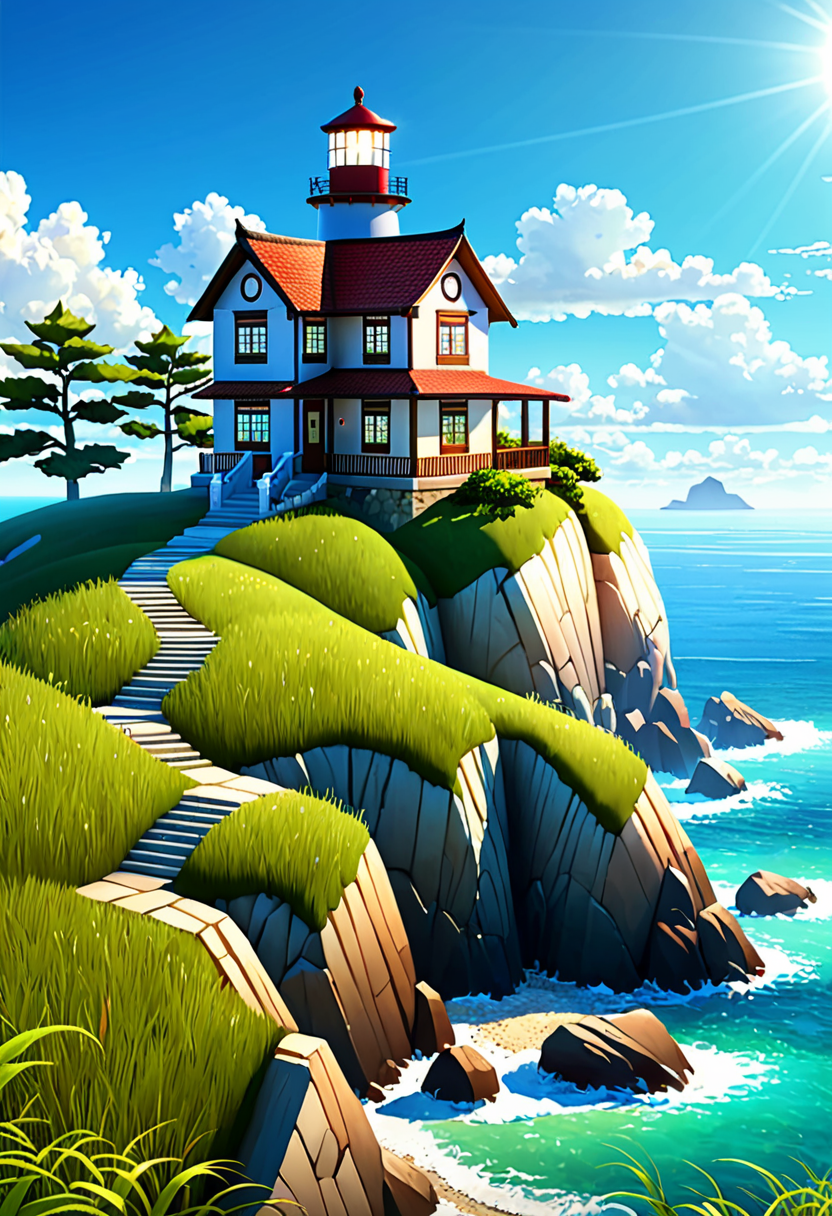 light house,by the sea,rock,wood house,grass,(masterpiece),((ultra-detailed)),(highly detailed CG illustration),(expressionless),(best quality:1.2),High quality texture,intricate details,detailed texture,High quality shadow,Cinematic Light,Depth of field,light source contrast,perspective,20s,(ulzzang-6500-v1.1:0.5),<lora:add-detail-xl:1>,