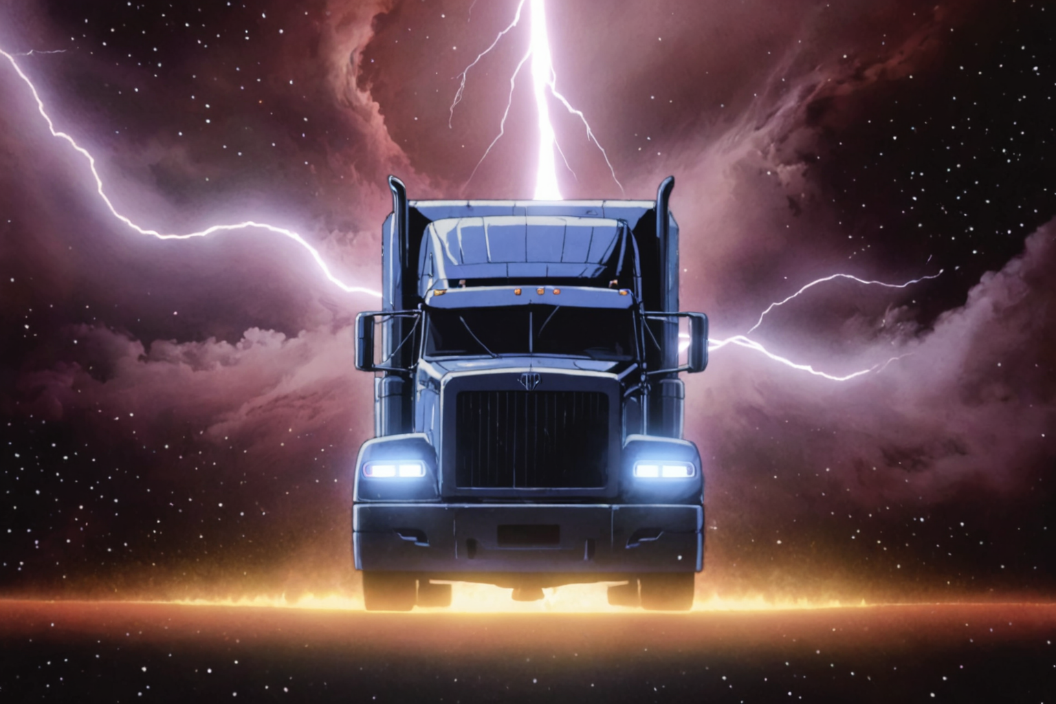 front view of a flying 18 wheeler in space, lightning, <lora:xl_yoshiaki_kawajiri_v1:0.8>